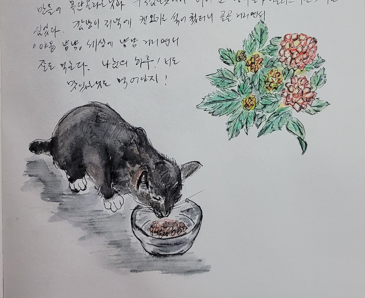 깜냥이 저녁에 캔고기를 섞어 줬더니 골골거리면서 '야옹 냠냠' 거리면서 잘도 먹는다.
