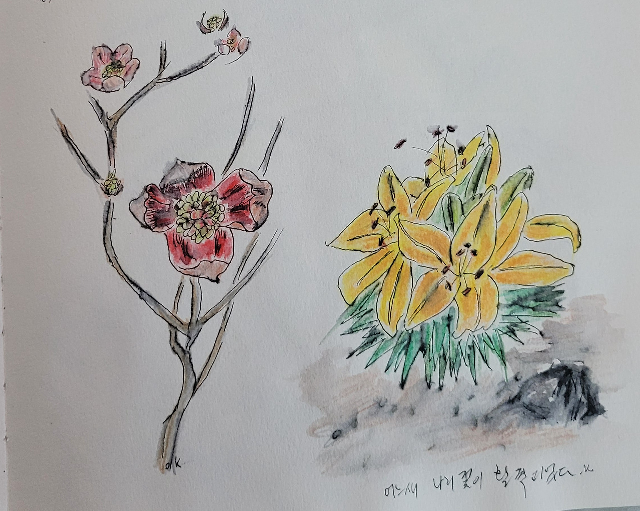 한편에 나리꽃은 노랑꽃을 활짝 피웠다.