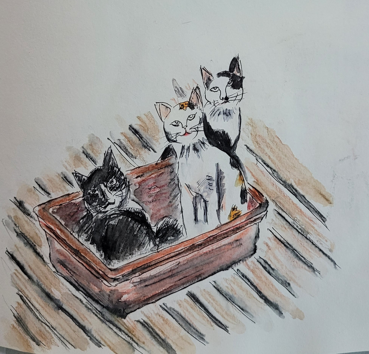 깜냥이와 삼색이는 야채 화분 통 안에 있고 콧선생은 옆에 있다.