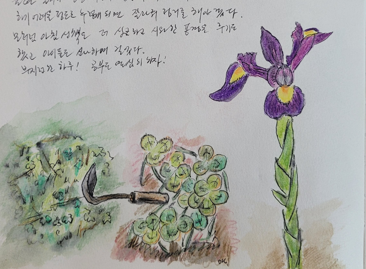 앞정원 현관 앞에 심었던 (그림일기 1편에서) 아이리스 블루매직이 두 그루 활짝 예쁜 꽃을 피웠다.