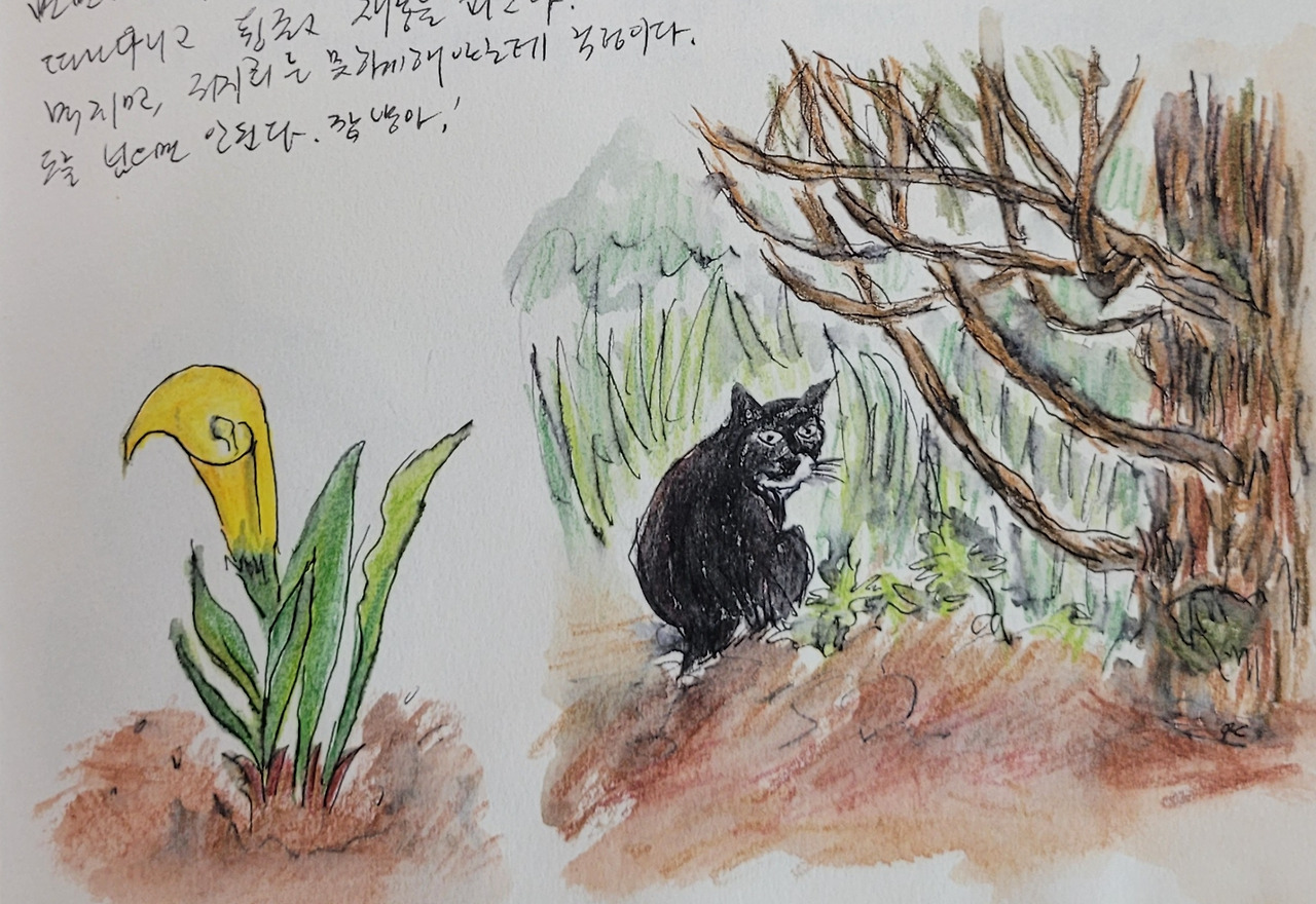 풀 뽑다 보니 지난 3월 7일 심었던 카라 구근 3개 중 두 개에서 꽃이 피었다. 장날 꽃가게에서 팔던 카라는 큰 아이였는데 우리 마당엔 아기 카라가 올라왔다.