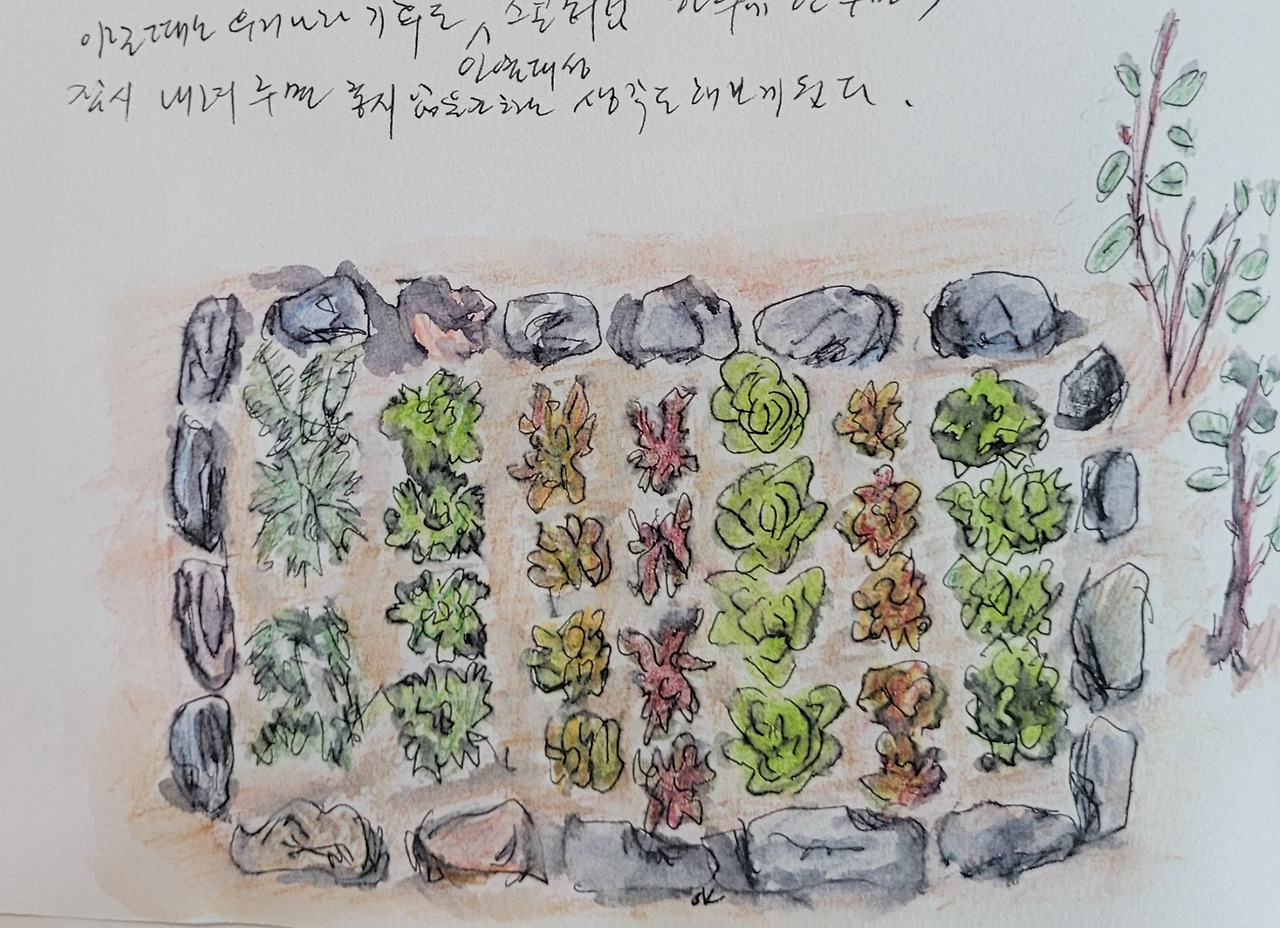 온실을 걷어낸 앞쪽 채마밭 주변으론 장미가 심어져 있어 채마밭으론 적당하진 않지만 이른 봄 채소밭으로는 해가 잘 들어 좋다. 돌담으로 구분되어 가지런히 자라고 있는 모습을 위에서 내려다보니 군인들이 정렬해 있는 것 같다.