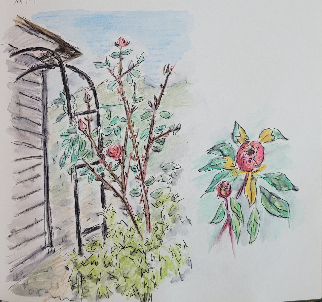 높이도 2미터가 넘고 폭도 꽤 넓은 아치였다. 높이 올라온 장미 송이를 연결해 주고 돌로 고정해 주니 장미도 살려 주는 것 같아 없을 때보다 훨씬 보기 좋다.
