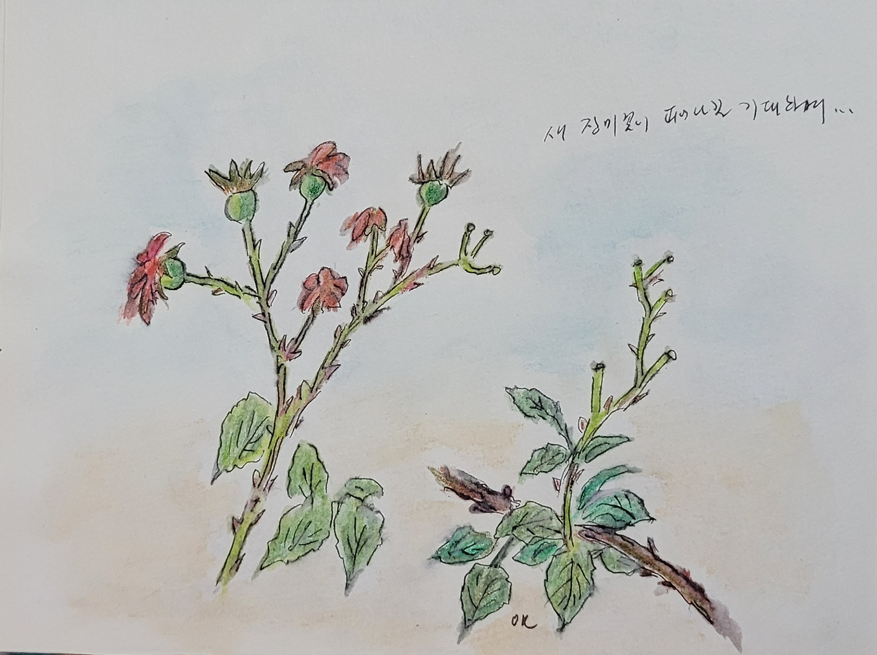 장미는 피고 지고 반복한다. 정원의 사계장미를 잘라주면 옆에 새 봉오리가 올라온다