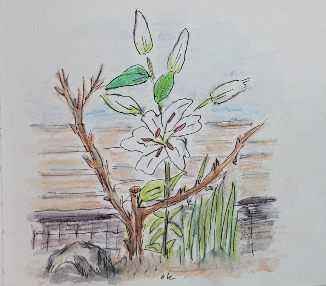 마침 옆에는 지난번에 지인이 준 노란 장미를 심었는데 그 사이에서 백합꽃이 핀 것이다. 가시밭(장미)에 한송이 흰 백합이 된 것이다.