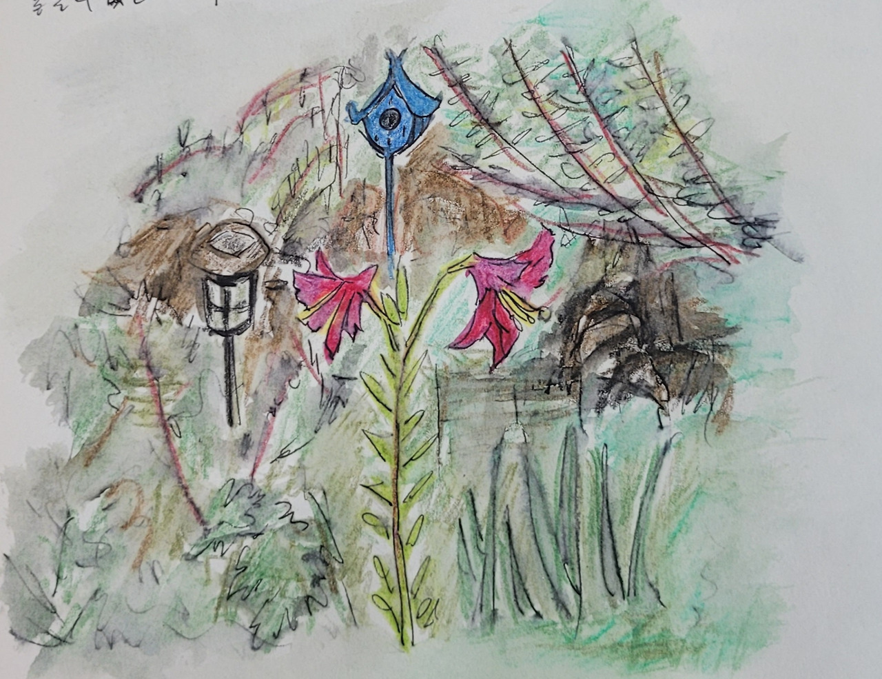 돌담 앞에도 백합이 있는데 꽃분홍 백합이 예쁘게도 피었다. 구석에 세워둔 파란 새집 오브제, 새 한 마리 찾은 적 없지만 묵묵히 서있다. 바라보는 사람의 마음만 들락거리는 것을 볼 뿐이다.