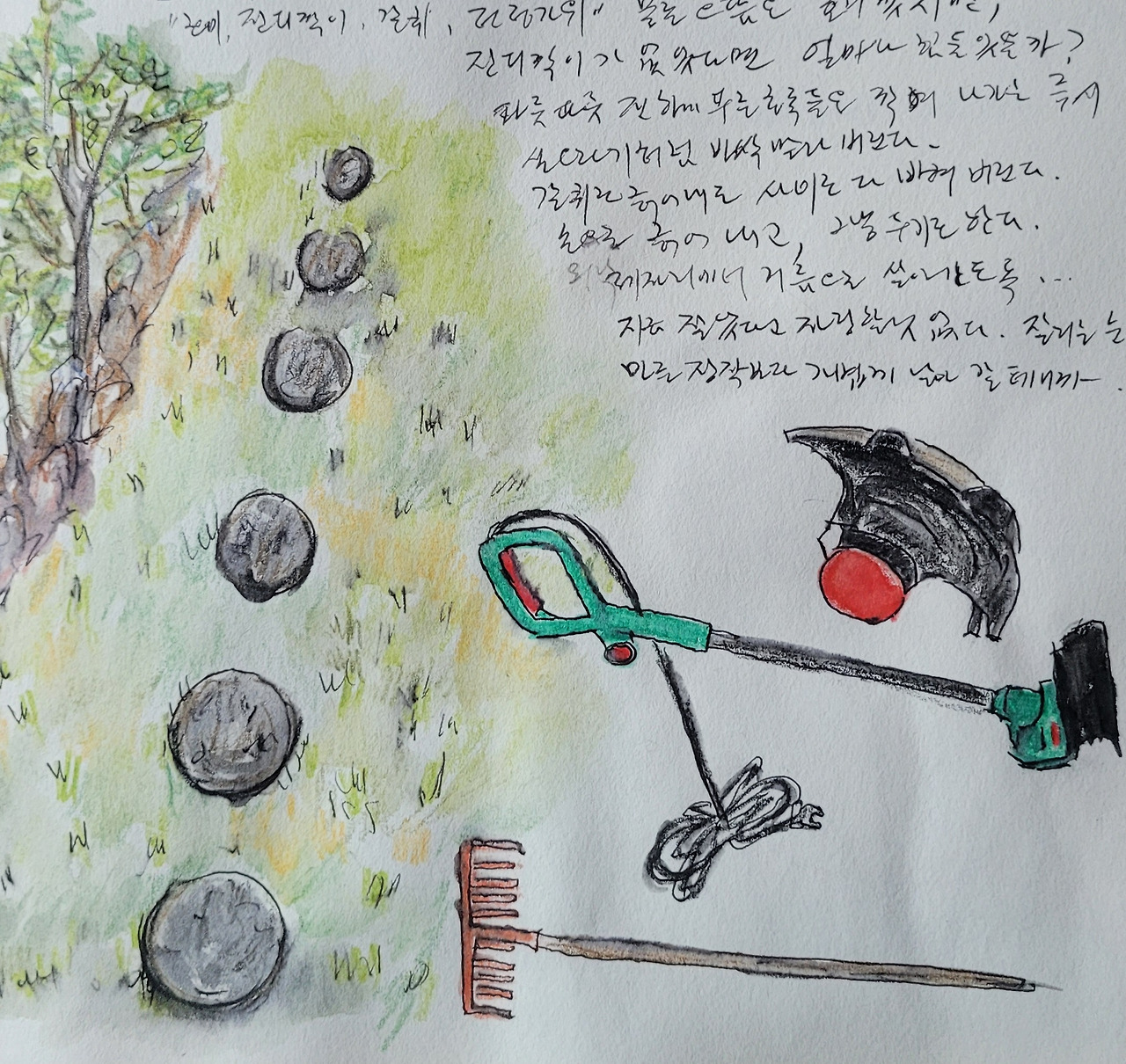 아침이슬로 파릇파릇 촉촉해진 잔디와 풀이지만 깎여 나가는 즉시 실오라기처럼 바싹 말라버린다. 갈퀴로 긁어내도 대부분 빠져버릴정도다. 빠져나가는 것들은 제자리에서 거름으로 살아가도록 둔다. 지금 안 깎였다고 좋아할 것도 없다. 잘 자라면 결국 깎이게 될 것이고 깎이는 순간, 마른 장작보다 가볍게 날아갈 테니말이다.