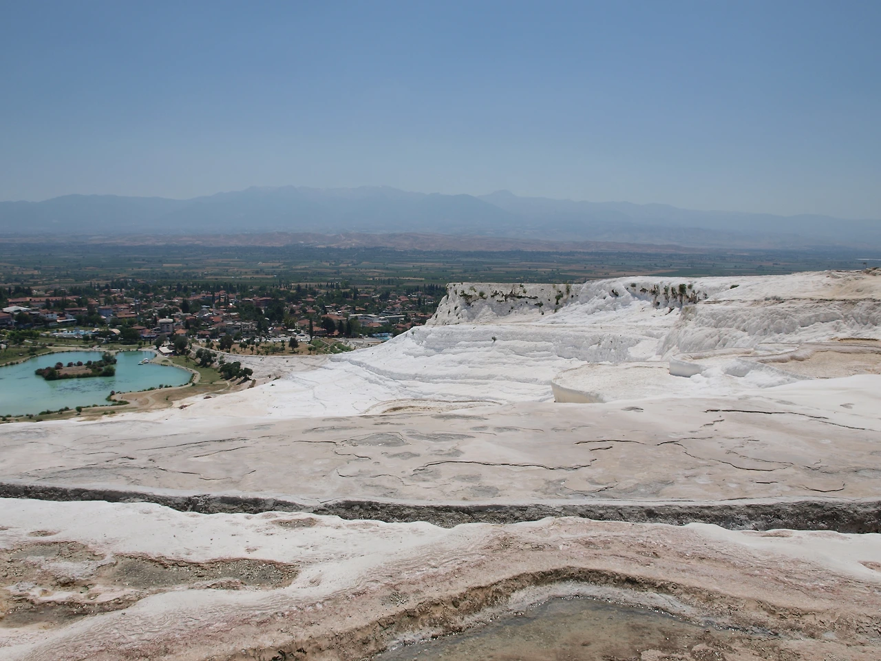 파묵칼레의 지형은 뭐라 표현하기 힘들다. 이런 지형이 있을까 싶다. 그럼에도 주변은 조그만 도시다. 별로 큰 건물도 없고, 리조트 같은 호텔과 작은 식당들이 있을 뿐이다. 경제적으로 어려워 크게 개발하지 않은 면도 있겠으나, 별로 꾸미지 않고, 있는 그대로 두고 볼 수 있는 사람들도 한 몫하는 것 같다. 우리였으면 땅투기자들부터 우르르 몰려와 개발하느라 분주했을 것이다. 이런 세계적인 명소임에도 일급 호텔 하나 없다. 그래서 오랫동안 성형 안 한 얼굴로 보존이 가능한 것 아닐까.