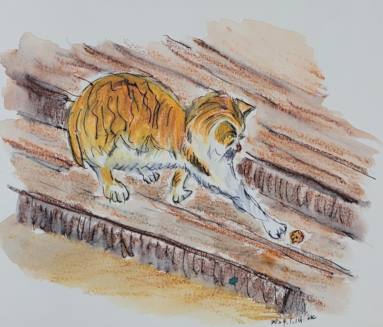 삼색이는 집묘가 돼버린지라 밥때면 제집으로 들어가 밥그릇에 밥 채워주기를 기다린다. 얌전히 밥그릇의 밥을 비우고 옆에 물그릇에 있는 물을 먹고 입을 가신다. 물론 깜냥이와 콧털이도 밥그릇에 담아주는 그래로 잘 먹는데, 이런 모습에 익숙하다 삶은 달걀 한 조각을 요리조리 돌려대며 왔다 갔다 하다 먹는 솜이를 보니 마음이 짠하다. 맛은 있는지 밥그릇 쪽으로 오지만, 또 한 덩어리 덜어내어 양손으로 쥐 잡듯이 한다.