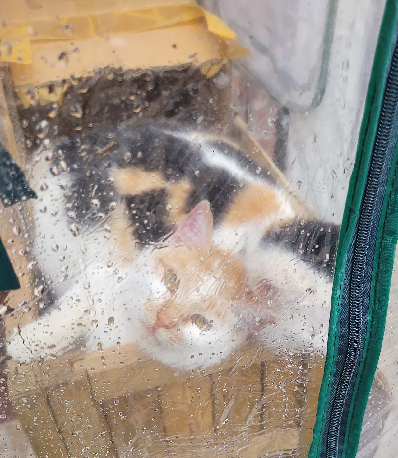 하루종일 내리는 비에 아침 먹고 마실 나가던 솜이 모자는 집에서 꼼짝 않는다. 이리저리 둘이 부대 까며 뒹굴기도 좁은 온실집안에서 너스레 비구경을 하며 낮잠을 즐긴다.