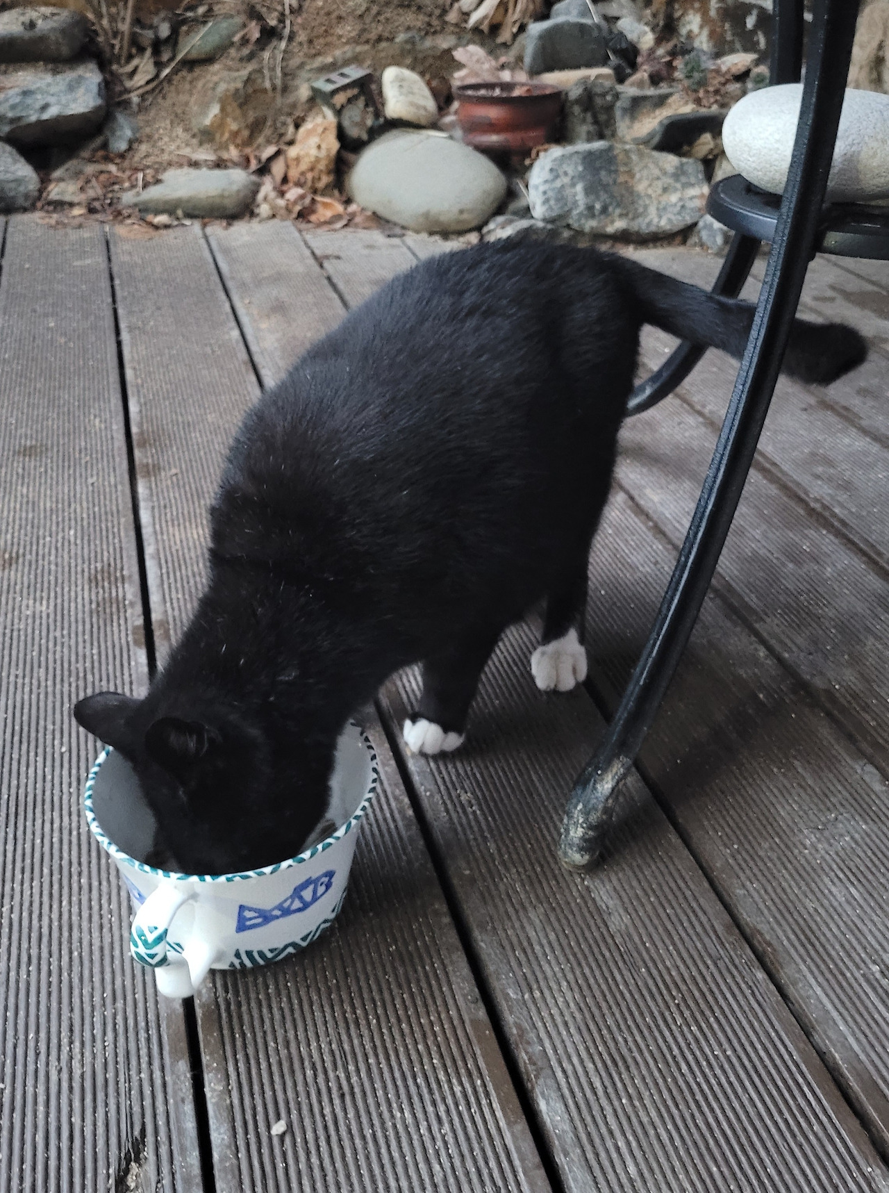 며칠 전 아침 주며 보니, 깜냥이의 배가 유난히 부르다는 것을 느꼈다. 혹 무슨 병이라도 걸렸나? 배가 왜 저리 부르지? 깜냥이는 워낙 까칠해서 만져주는 것을 잘 허락하지 않는다. 그래도 밥 먹는데 가까이 가서 보니 꼭 임신한 것 같았다. "쟤는 수놈인데?" 작년 일 년 동안 정원일기의 날아다니는 자유로운 영혼의 대표적 생명체였던 깜냥이, 소년 깜냥이였는데...