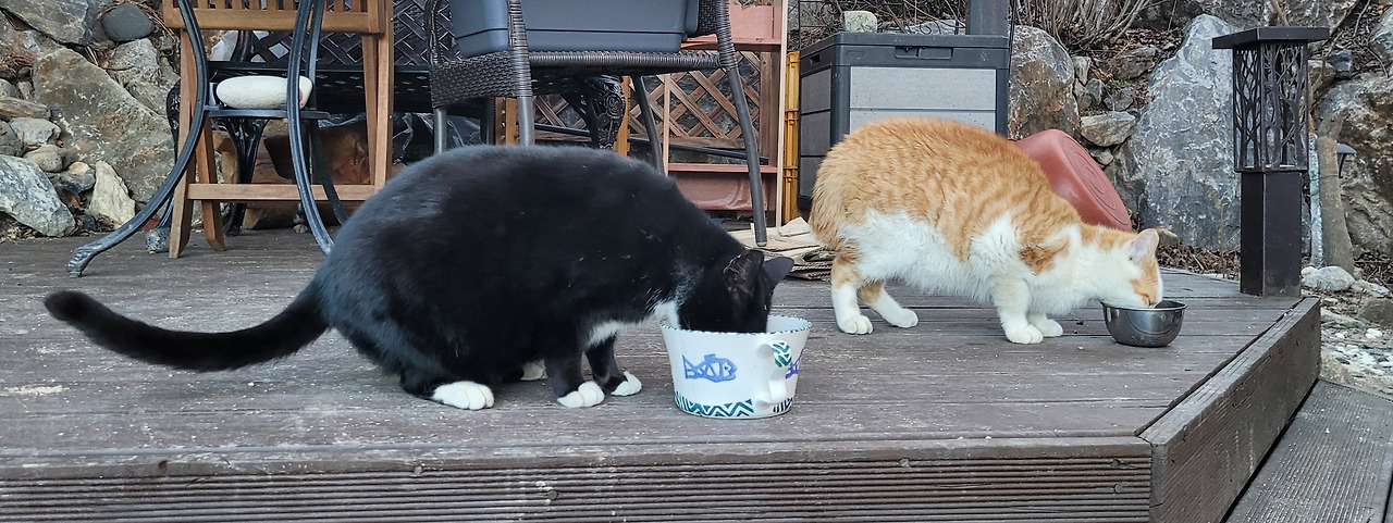 다른 작가님 얘기를 보면 길냥이들 식사 때도 싸우는 경우가 있다는데 우리 집 길냥이들은 사이가 참 좋다. 눈치가 빨라 싸우면 혼날 것을 알아서인지, 제 밥그릇 앞에서 감사히 먹는다. 간혹 솜이가 제 밥 남기도도 남의 밥을 탐내도 삼색이나 깜냥이가 화내지 않는다. 덩치는 저희만 해도 아직 아기란 것을 아는 것처럼...