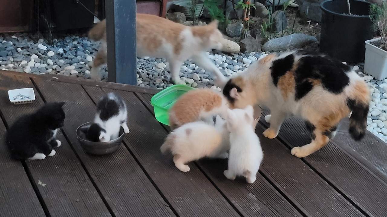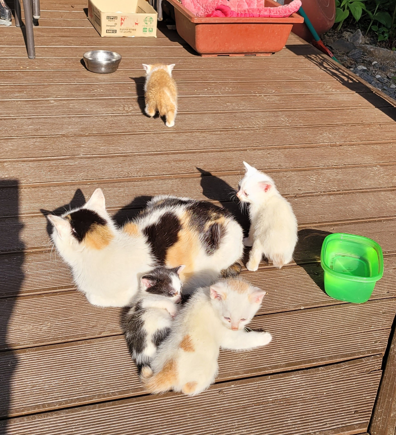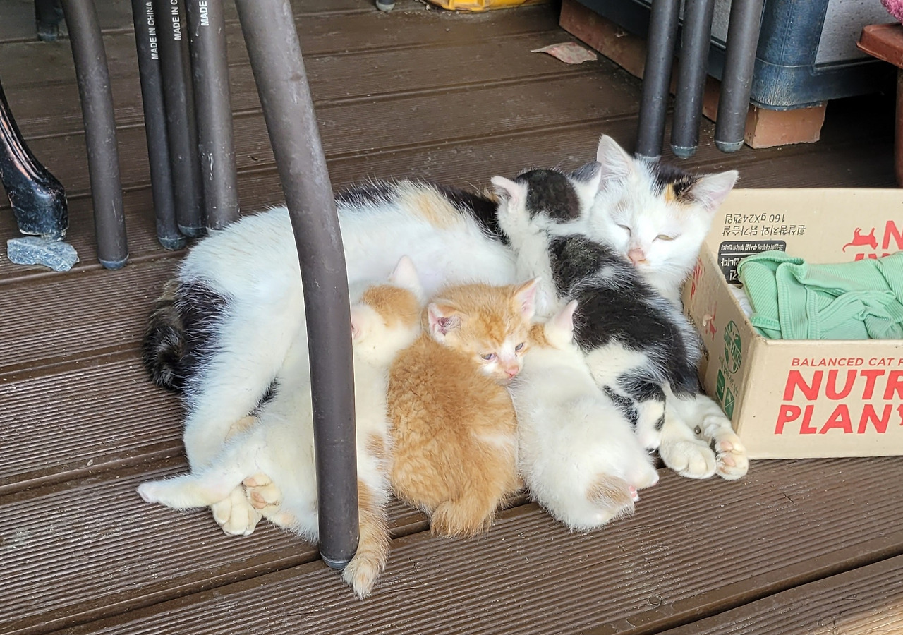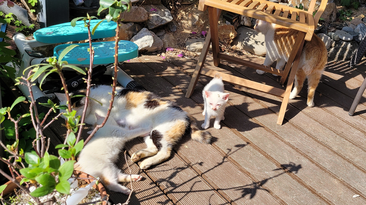 아가냥이들은 아직은 데크 주변을 떠나지 않는다. 솜이와 삼색이는 드러누워 있다가도 멀리 가면 목을 물어 데리고 온다. 솜이가 동생들을 너무 잘 돌본다. 고양이 육아는 엄마만 하는 것이 아니다. 길냥이도 이렇듯 온 가족이 서로 돌보는 모습을 보니 오히려 이기적인 인간들이 배워야 할 점이 많다는 것도 느낀다.