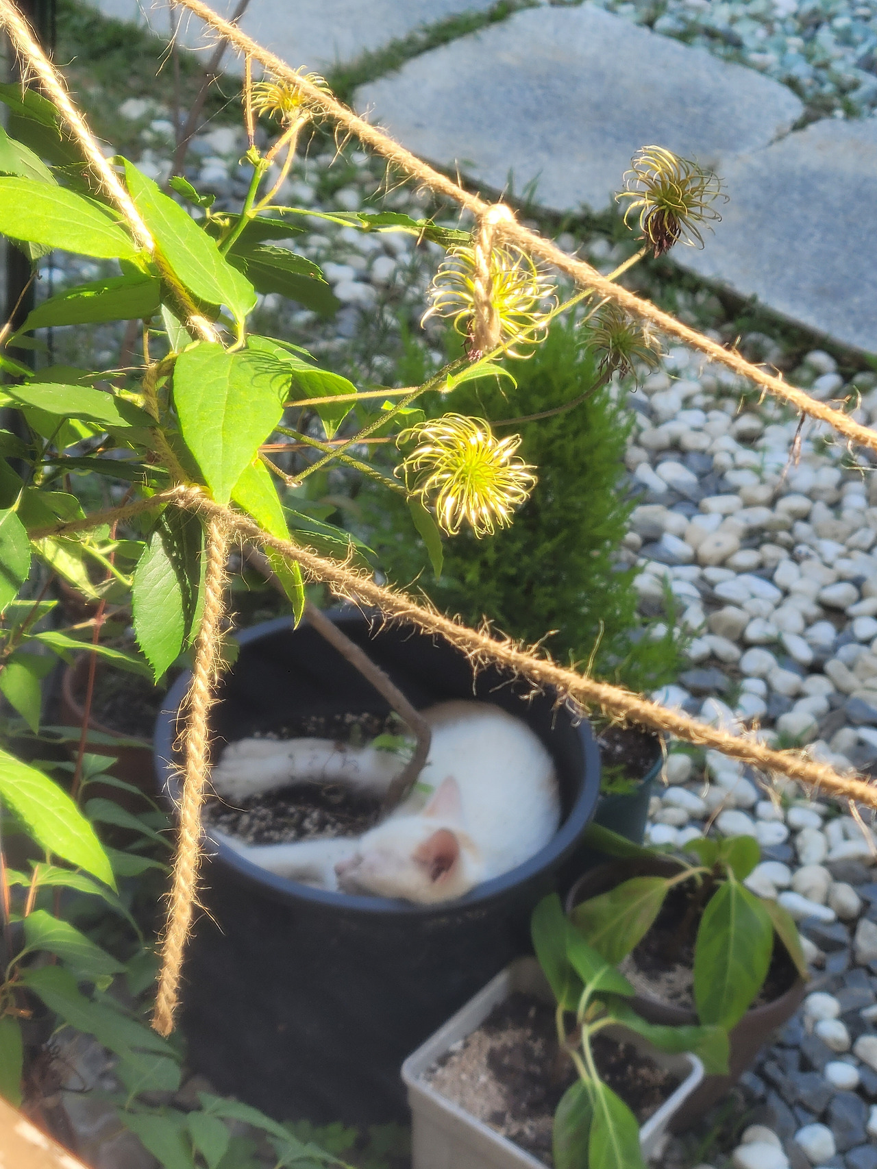 아침이면 노래하며 꽃들을 깨우는 새들과 부지런히 꽃가루를 날라주며 자신의 영양도 섭취해 가는 벌들... 정원 숲 곳곳에서 날아다니는 고양이 꽃들도 큰 몫을 한다. 아기 삼냥이 녀석들은 가지를 부러트리기도 하며 구석구석 땅을 파고 볼일을 본다. 초목들이 좋아할 양분이나 될지 모르지만, 야단도 치지만 쫓아다니며 막을 수도 없다. 고양이꽃도 정원의 엄연한 일원이기 때문이다.