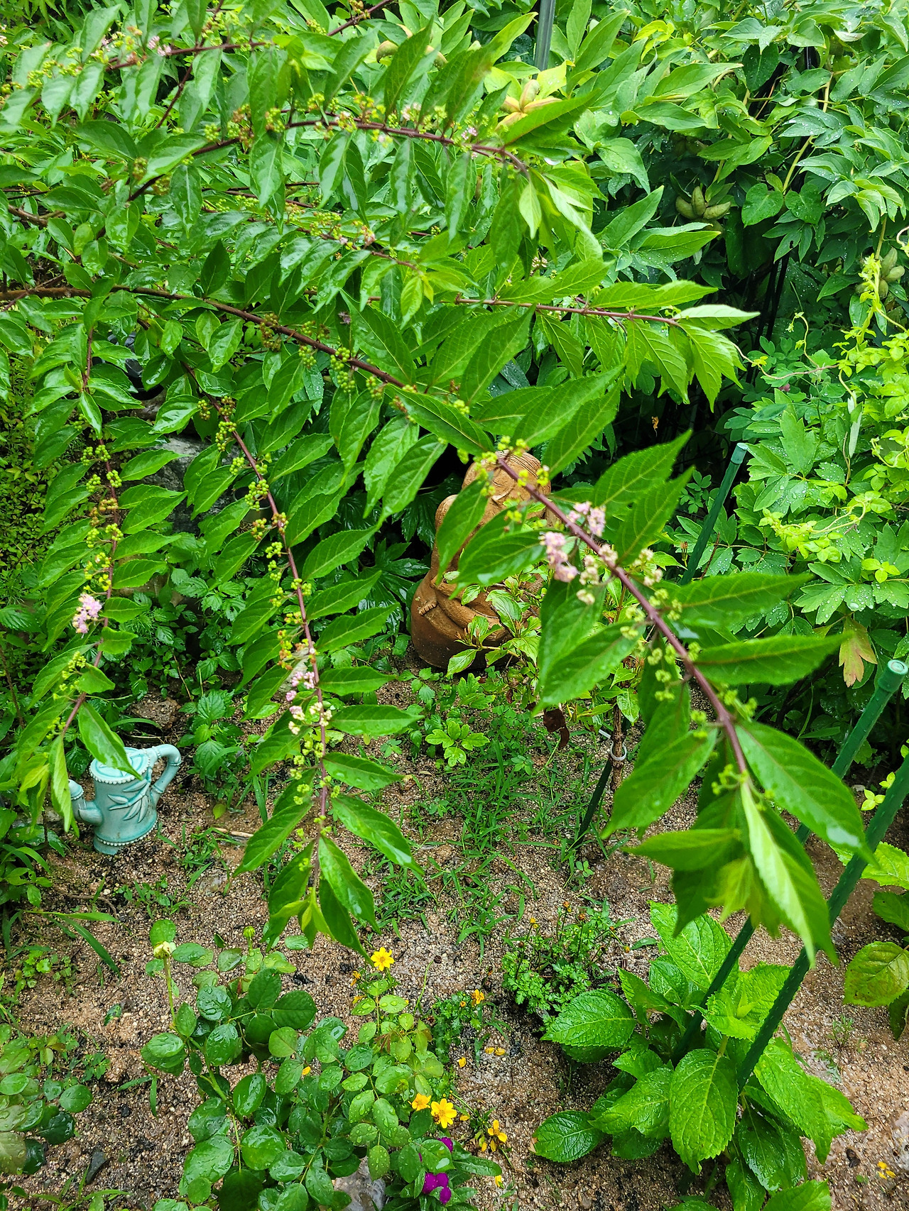 화려한 봄의 전령이었던 하얀 목련과 눈부시게 희고 부드러운 살색을 자랑했던 모란꽃, 하늘거리던 안개꽃나무, 꽃분홍 밥알꽃이 서러웠던 박태기나무, 봄을 더 길고 아름답게 빛내주었던 산딸나무와 서부해당화는 무성한 잎으로 덮여 벌써 몇 번은 잘라준 것 같다. 삼색플라밍고는 바람 부는 대로 흔들리는 것을 그대로 두면 감당 못할 정도로 자란다. 상고머리 쇼트커트로 잘라준지도 얼마 되지 않은 것 같은데 다시 덥수룩한 머슴아 머리다. 가위를 요구하고 있다.