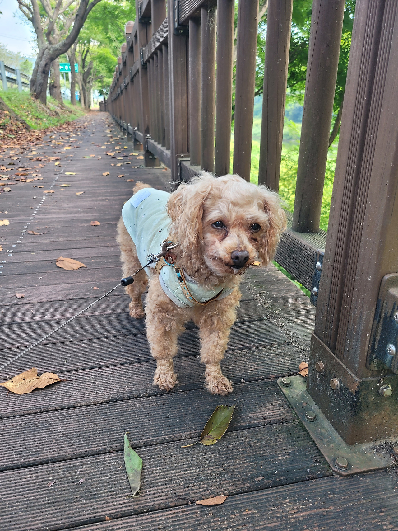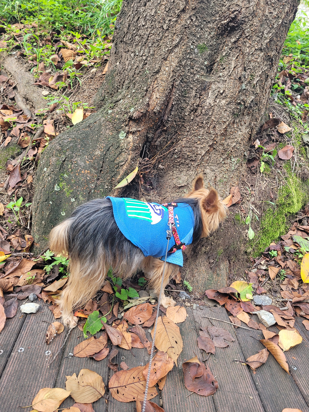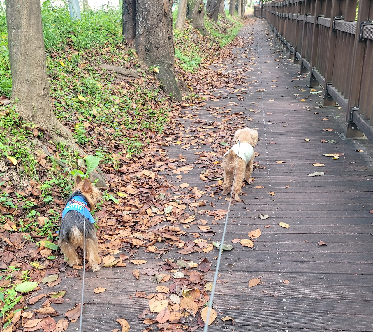 폭신한 낙엽길을 밟으며 산책하는 샐리와 보리