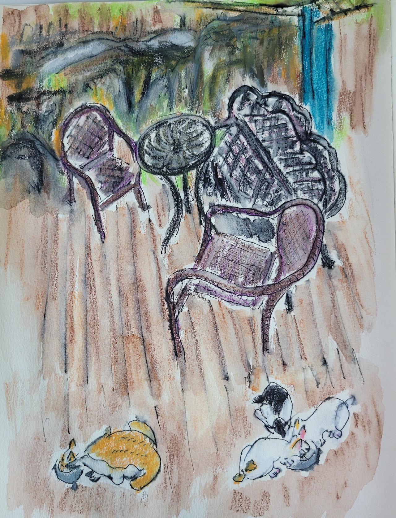 나이 든 강아지 셋을 산책시킨 후 가제보아래 장의자에 앉힌 후 잠시 쉰다. 눈치 없이 가라 해도 가지 않는 삼냥이들을 보며 샐리와 보리는 쉴 새 없이 짖어댄다.