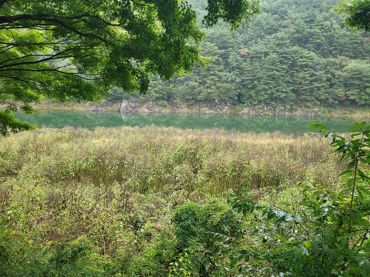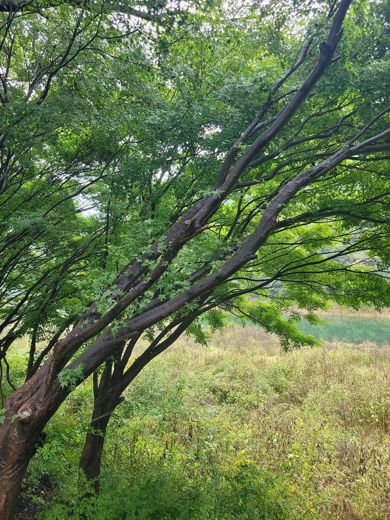 산과 동무하여 앞을 향해 흐르는 강 물길엔 돌 용까지 초록빛 강물을 딛고서 비상하고 있다. 혹독했던 여름철 그늘로 몸 바쳐 봉사했던 데크옆 굵은 단풍나무는, 채색옷으로 갈아입으며 하나둘 가을 반기는 일을 시작하고 있다. 수수하고 겸손하게 여름을 지켜왔던 청단풍들까지 화려하게 갈아입기 위한 차비를 하고 있는 가을 아침이다.