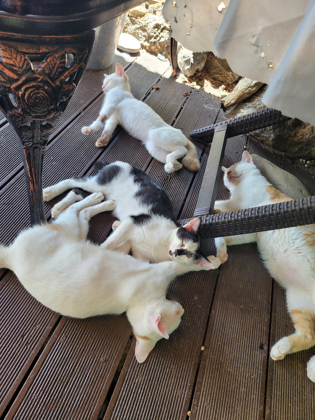 삼색이가 떠난 후 솜이와 세 녀석... 제일 위에 누워있는 냥이가 올여름에 떠난 호프