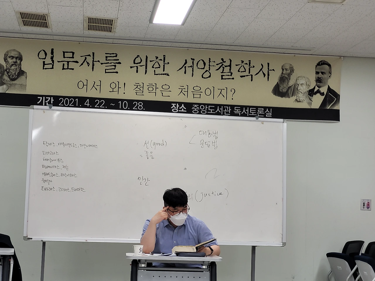 철학이란 게 한두 번 읽는다고 쉽게 깨우치는 게 아닌 것 같다. 강의 내용을 정리하면서 생각하고 모르는 것은 메모해 두었다가 수업에서 질문하고 토론시간에는 적극적으로 내 생각을 발표하고 또 질문하기를 반복하며 익혀나가려 한다.나의 철학 공부는 현재 진행형이다.