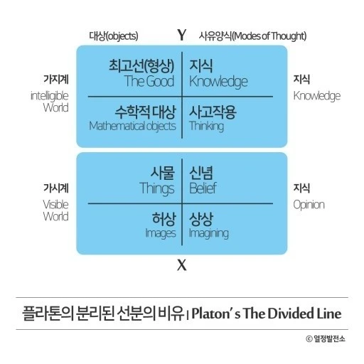 <이제 당신들은 이 네 부분과 상응하는 것으로서 정신의 네 가지 상태를 생각할 수 있을 것이다. 제일 높은 것은 순수지(純粹知), 직관지(直觀知)며, 두 번째는 추론지(推論知), 간접지(間接知)며, 세 번째는 신념이며, 네 번째는 상상이다. 당신들은 이 용어들을 비율에 따라 그 각각에 대해서 명확성과 확실성의 정도를 배분한다.>