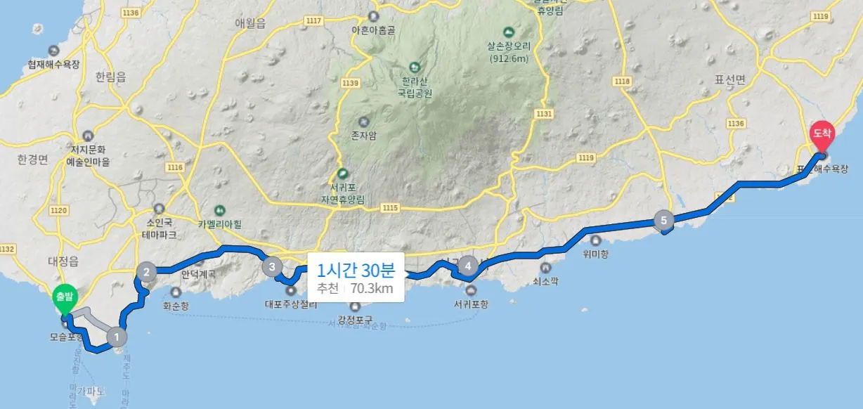 모슬포항 – 송악산 – 산방산 유채꽃밭 – 중문해수욕장 – 이중섭거리 – 남원큰엉해변 – 표선해수욕장