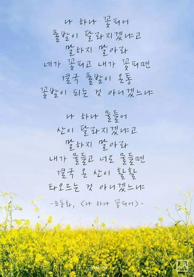조동화 시인은 "나 하나 꽃피어 풀밭이 달라지겠냐고 말하지 말아라"라고 했다.
