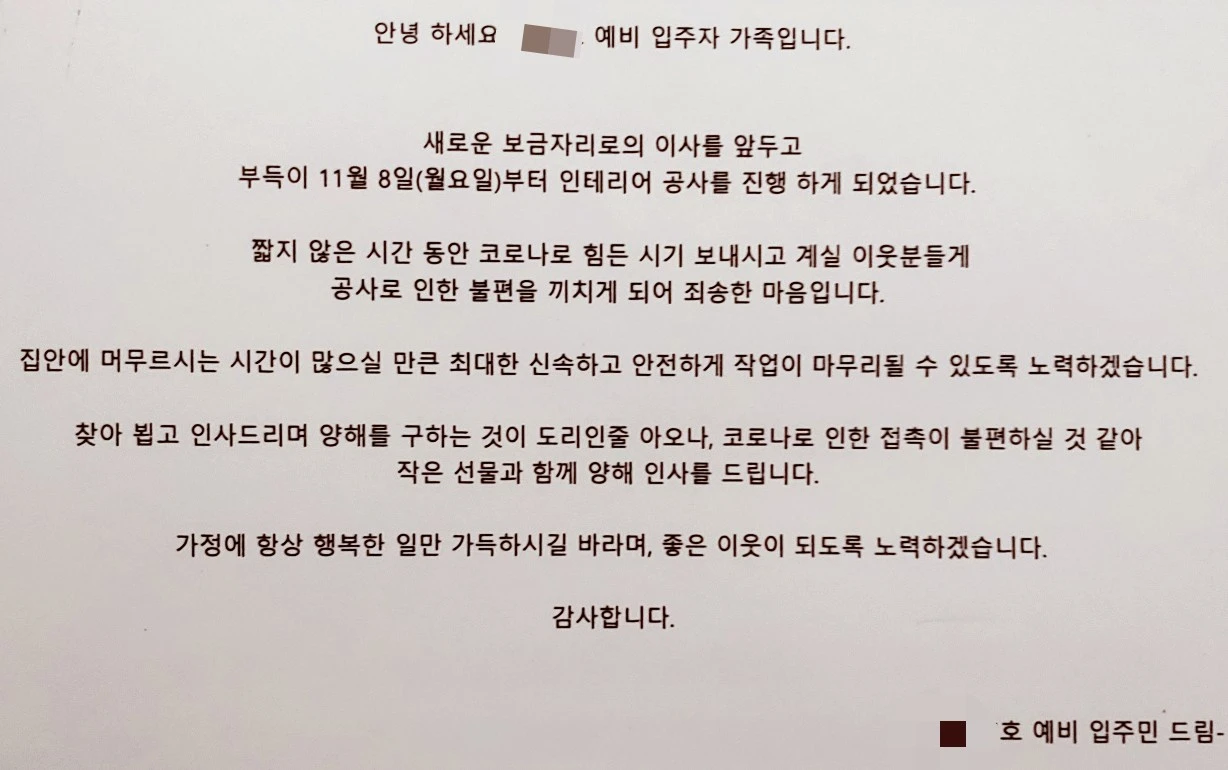 공사 소음이 크게 들리는 같은 층의 우리 집과 위층, 아래층 5 가구에 선물이 전달되었다.