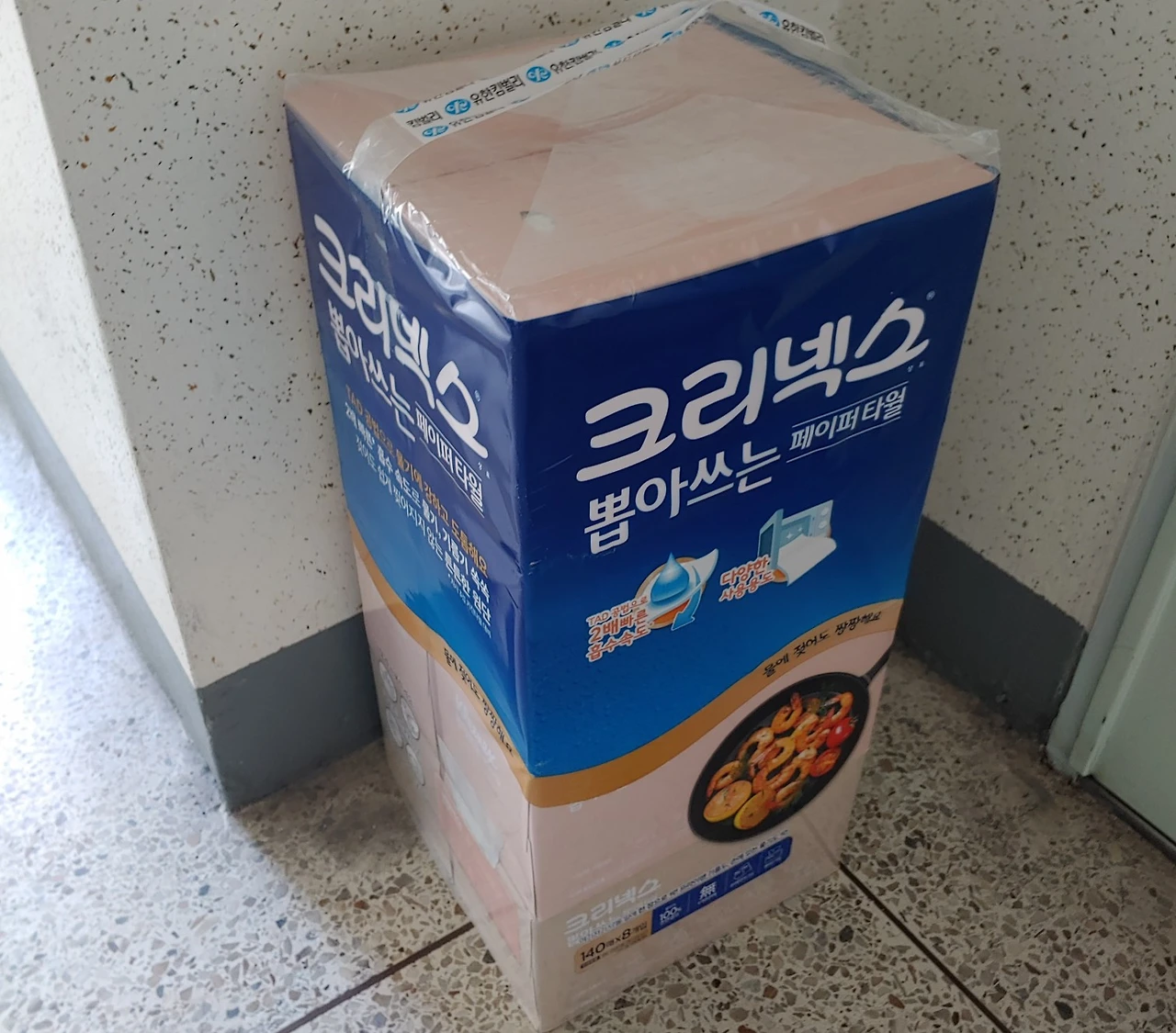 그런데 오늘 아침 현관문에 붙어 있는 "공사로 불편을 끼쳐서 죄송하다"는 쪽지를 보았다. 바닥에는 화장지 세트가 놓여 있었다.