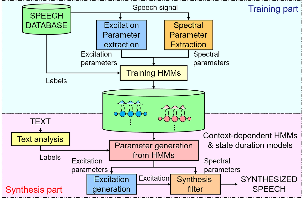 통계기반 파라메터 합성은 음성 특징 파라메터들을 추출하여 통계기반으로 모델링하는 훈련과정과, 텍스트가 입력되면 통계 모델로부터 해당하는 파라메터를 생성하여 신호처리를 통하여 음성으로 만들어내는 합성과정으로 구성된다.