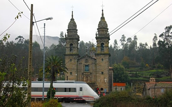 오래되어 이끼 낀 성당 앞으로 현대식 기차가 지나가는 모습이 대조적이다.
