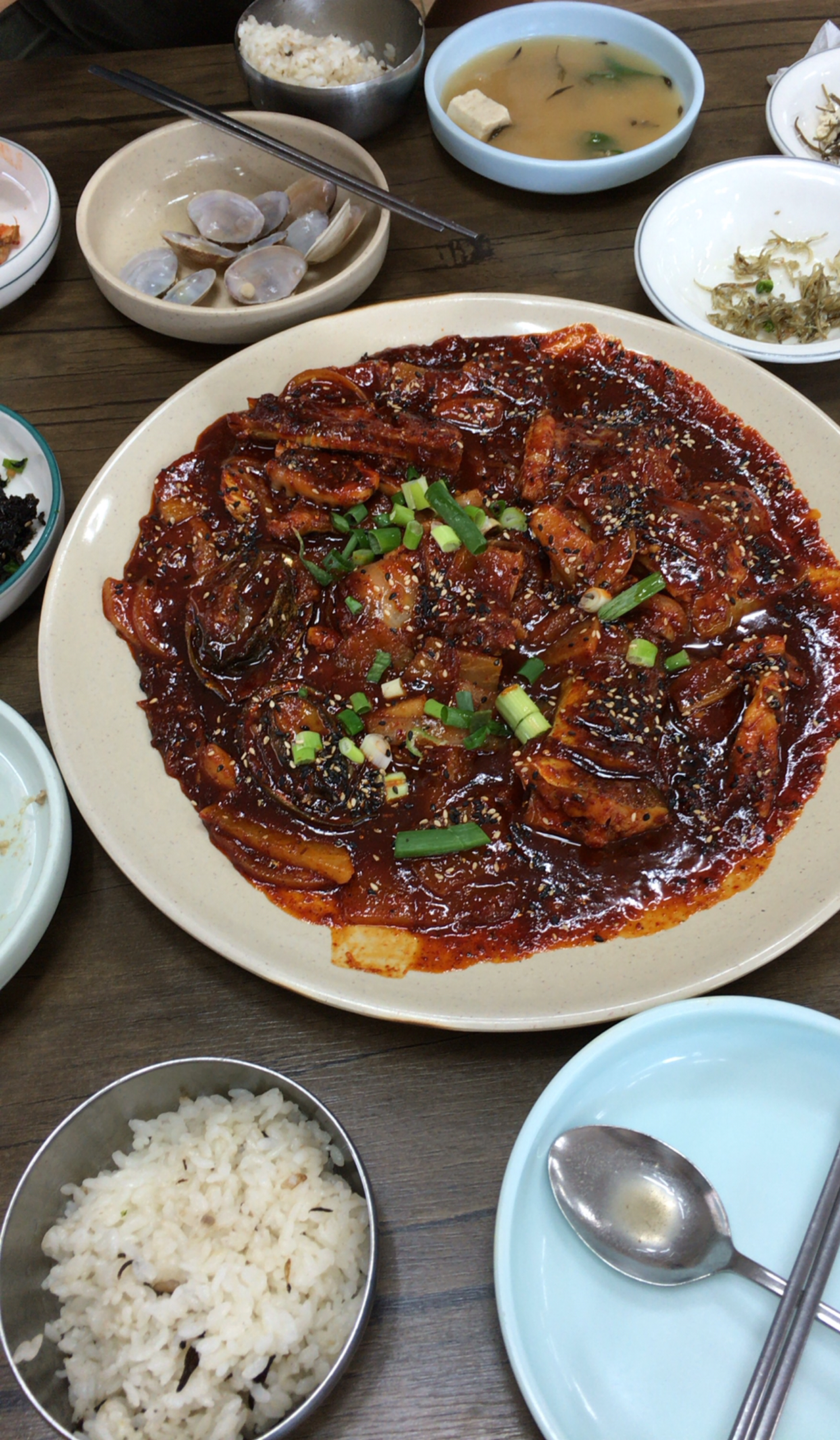 그리고 메인 메뉴인 전복낙지코다리찜. 전복은 작은 것이 인원 수대로 나온다. 낙지 양은 좀 아쉬웠고 코다리는 맛났다. 아무래도 4인분 사진과 비교하다 보니 좀 부실해 보였지만 둘이서 먹기에는 훌륭했다. 다만 단 맛이 조금 과하다는 것. 가족단위의 손님을 배려했을까? 먹고 나서 뒤끝이 깔끔하지 못한게 참 아쉽다.