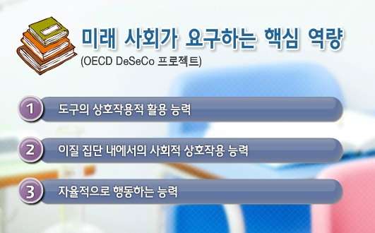 OECD에서 핵심역량이라는 말을 쓴 지가 꽤나 된 걸로 알고 있다. OECD의 DeSeCo 프로젝트에서 7년간의 연구끝에 2003년에 나온 개념이니.. 14년이나 되었네. 2015 개정교육과정에서 그 역량을 강조하였다. 그리고 그 역량을 키우기 위해서는 결과가 아닌 과정을 중심으로 평가해야 한다고 한다.