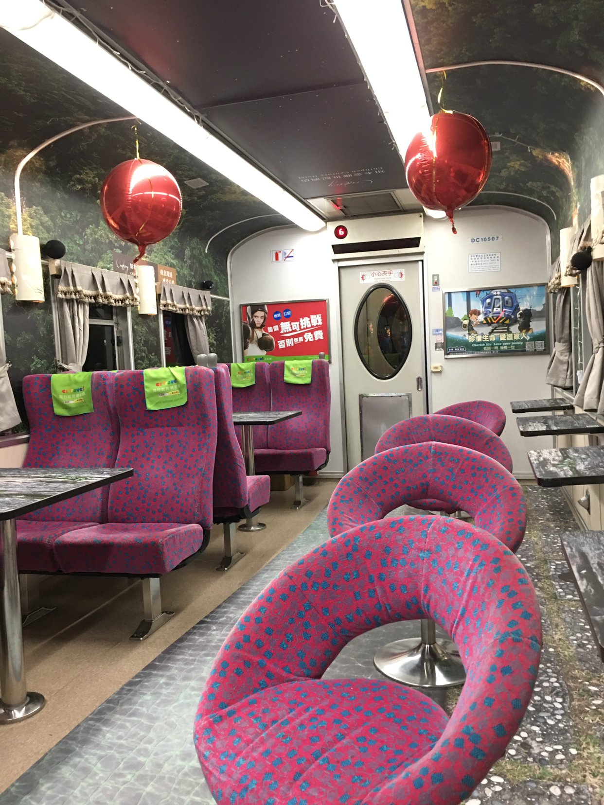 우리가 이용한 건 타이베이 역에서 출발하는 관광열차 비스무리 한 거 였다. 차음 대만 왔을 때 새마을호 같은 열차를 탔던 것 같았는데 가족여행이니 만큼 좀 더 비용부담을 하기로 했다. 이 열차의 장점은 관광객들만 탄다. 그러다 보니 거의 다 한국인. 좌석도 넓고 아침과 저녁을 주고 (아침은 버거, 저녁은 도시락) 음료 무한 제공에 식당칸, 노래방까지 있었다. 노래가 다 대만노래라는 건 함정.