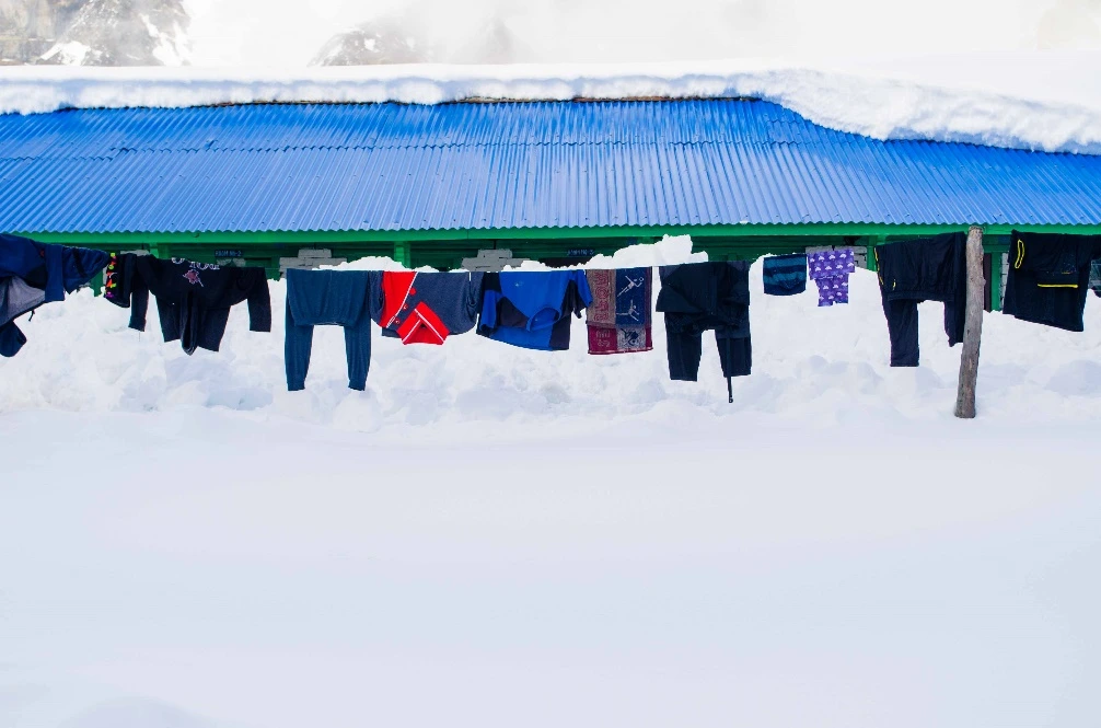 청정하고 맑은 히말라야 물로, 깨끗이 세탁한 빨랫감들을 따뜻한 햇살 아래 곱게 널어