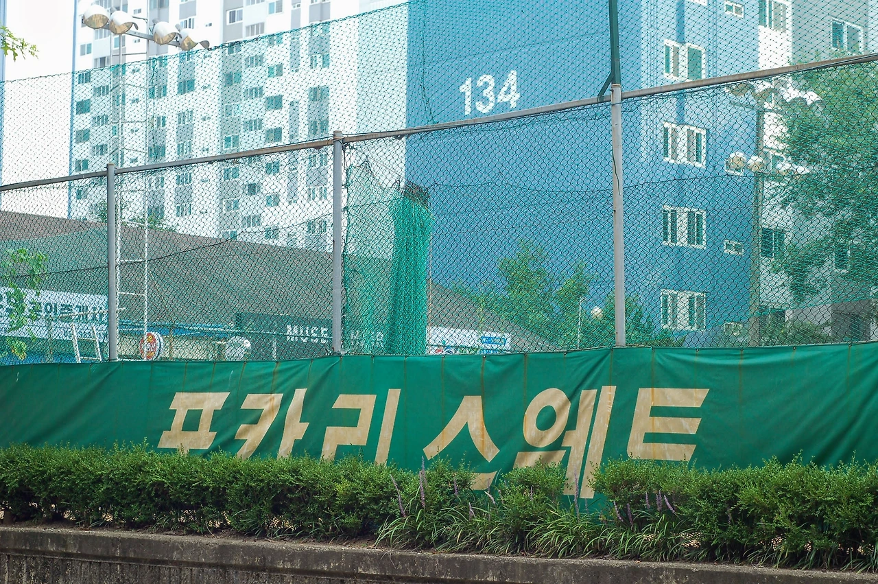 녹슨 쇠가 세로줄로 묻어나는 저 천막의,