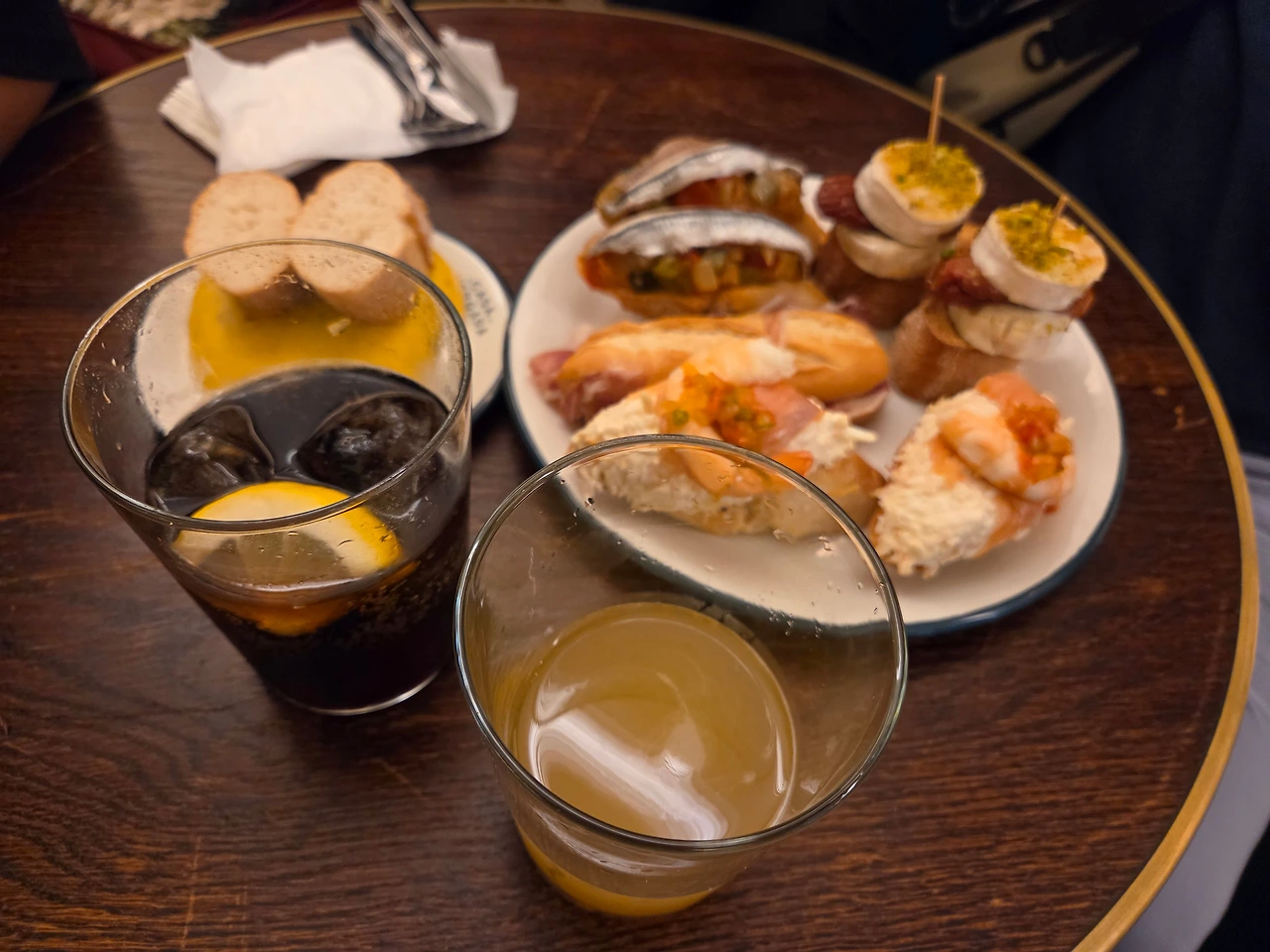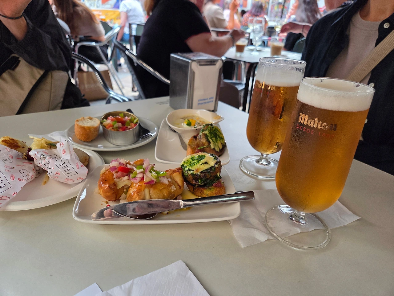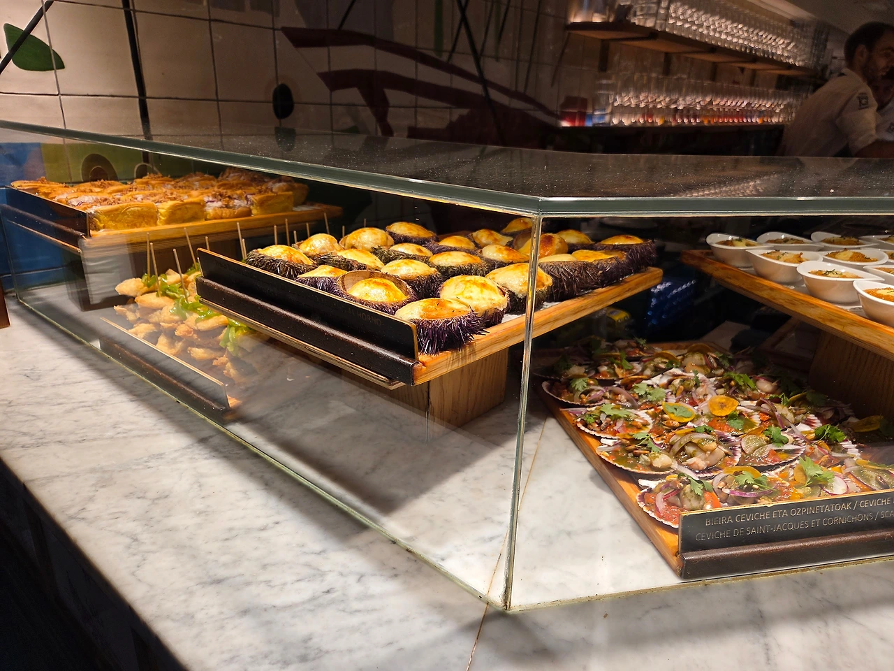 가리비, 멍게, 정어리, 새우, 치즈까지 다양한 재료로 만든 핀초스가 눈을 사로잡았다. 한 끼 식사는 아니고 안주와 비슷해서 바스크 지방 명물인 사과주인 시드라Sidra를 곁들여 먹었다. 시드라는 사과주와 다르게 사과 식초와 비슷한 맛이었다. 달지 않고 시큼했다. 핀초스를 다 먹고 입을 헹구기에 적합한 맛이었다. 원래는 여러 핀초 바를 돌아다니며 조금씩 먹어야 하는데 시간이 일러 많이 먹지 못했다.