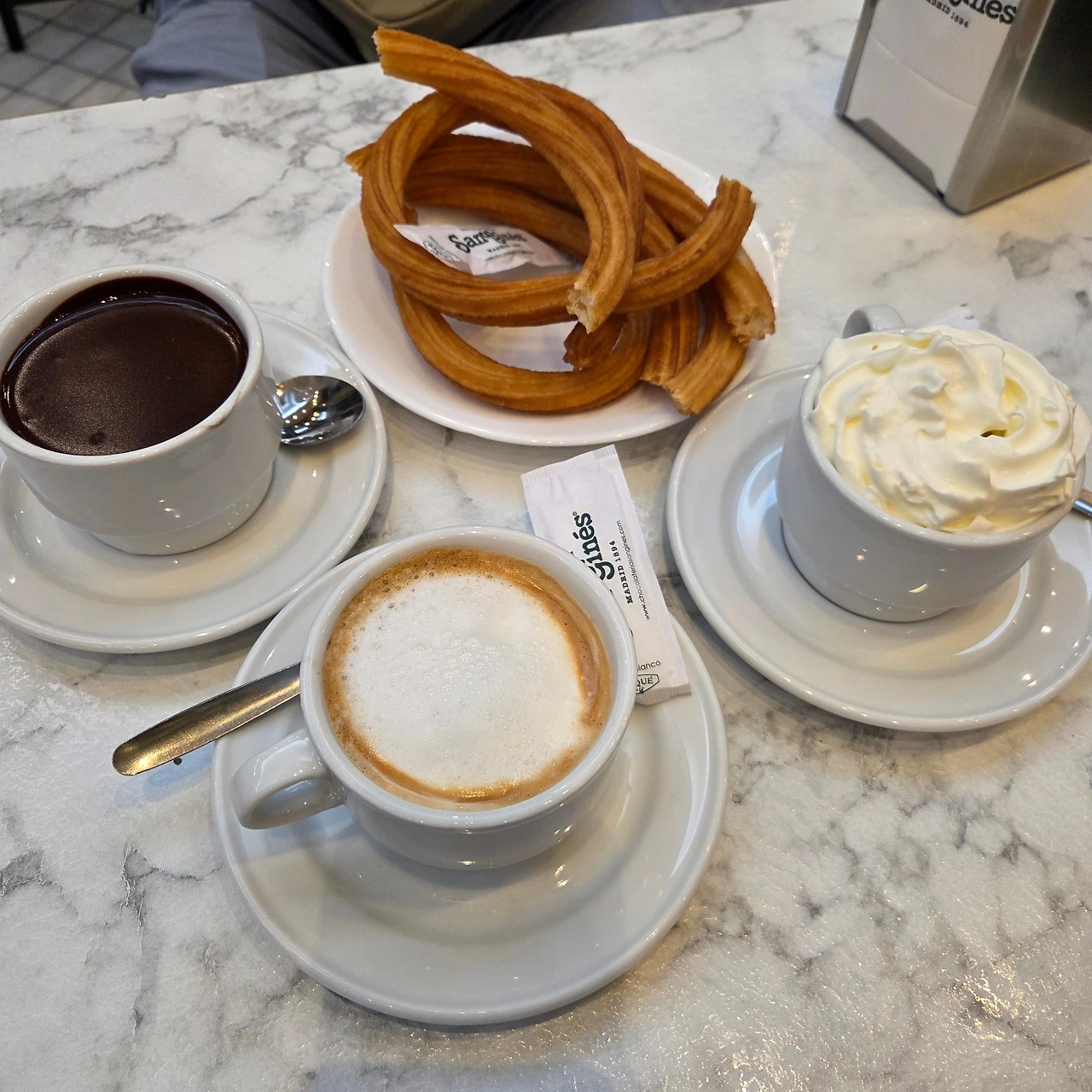 그리고 드디어! 추로스를 먹으러 산 히네스에 갔다. 10년 전에 산 히네스는 점포 1개였는데 이제 보니 근처가 온통 산 히네스였다. 우리는 그중에서 본점으로 들어갔다. 운이 좋게 기다리지 않고 주문 후 바로 먹을 수 있었다.