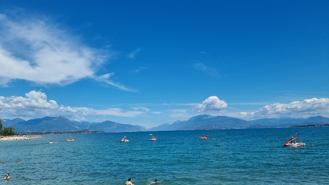 다시 조금을 달리자 가르다 호수가 보이기 시작했다. 우리는 가르다 호수를 둘러싸고 있는 마을 중 한 곳인 데센자노(Desenzano)로 향했다. 주차장을 찾아 차를 대고 조금 걸어 내려오자 끝이 어딘지 가늠할 수 없는 호수가 보였다. 파란 하늘 밑에 보이는 더 파란 호수가 27시간 동안의 피로를 잊게 해 주었다. 주황색 미끄럼틀이 달려있는 작은 배들 주변으로 웃고 있는 사람들이 호수에 둥둥 떠 있는 것이 보였다. 오랜만에 보는 한가로운 풍경에 나도 모르게 가만히 호수를 보고 서 있었다.