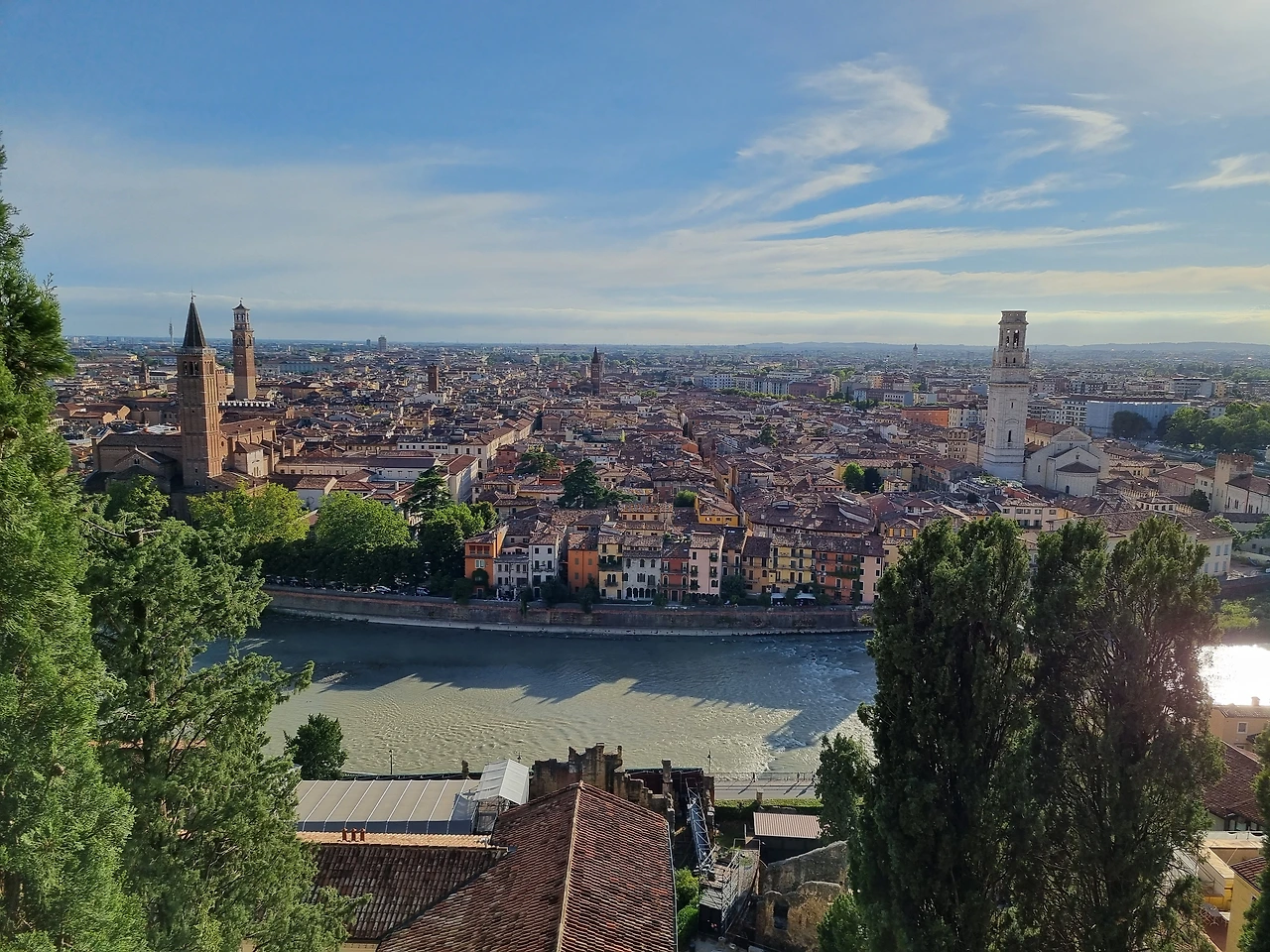 피에트라 다리를 지나 피에트로 성 쪽으로 가면 전망대에 올라갈 수 있는 푸니쿨라가 있다. 부모님의 무릎 보호를 위해 푸니쿨라를 타고 올라가기로 했다. 천천히 이동하는 푸니쿨라를 타고 전망대에 올라가니 뜨거운 햇볕 아래로 베로나와 베로나를 휘감고 있는 아디제(Adige)강이 한눈에 들어왔다. 우리나라에서는 볼 수 없는 주황색 지붕들과, 고대, 중세의 교회들, 첨탑들을 보고 있으니 '이게 진짜 유럽이지'하는 생각이 들었다.