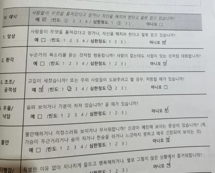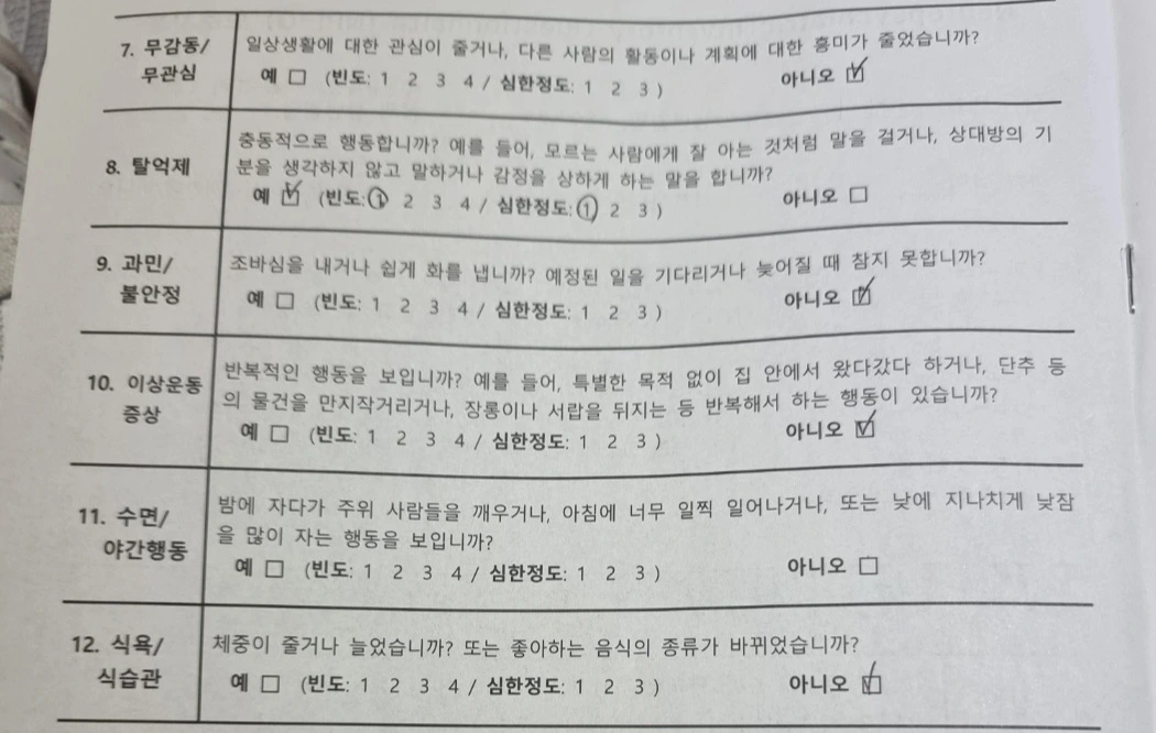 인지기능에 문제가 있다고 판단될 때만, '예'라고 체크를 해야하는데...