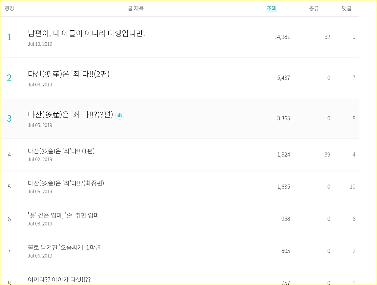 그리고, '다산은 죄다' 2편을 올린 사흘째, 마침내 조회수가 널뛰듯 하면서, 3000건에 육박했습니다.