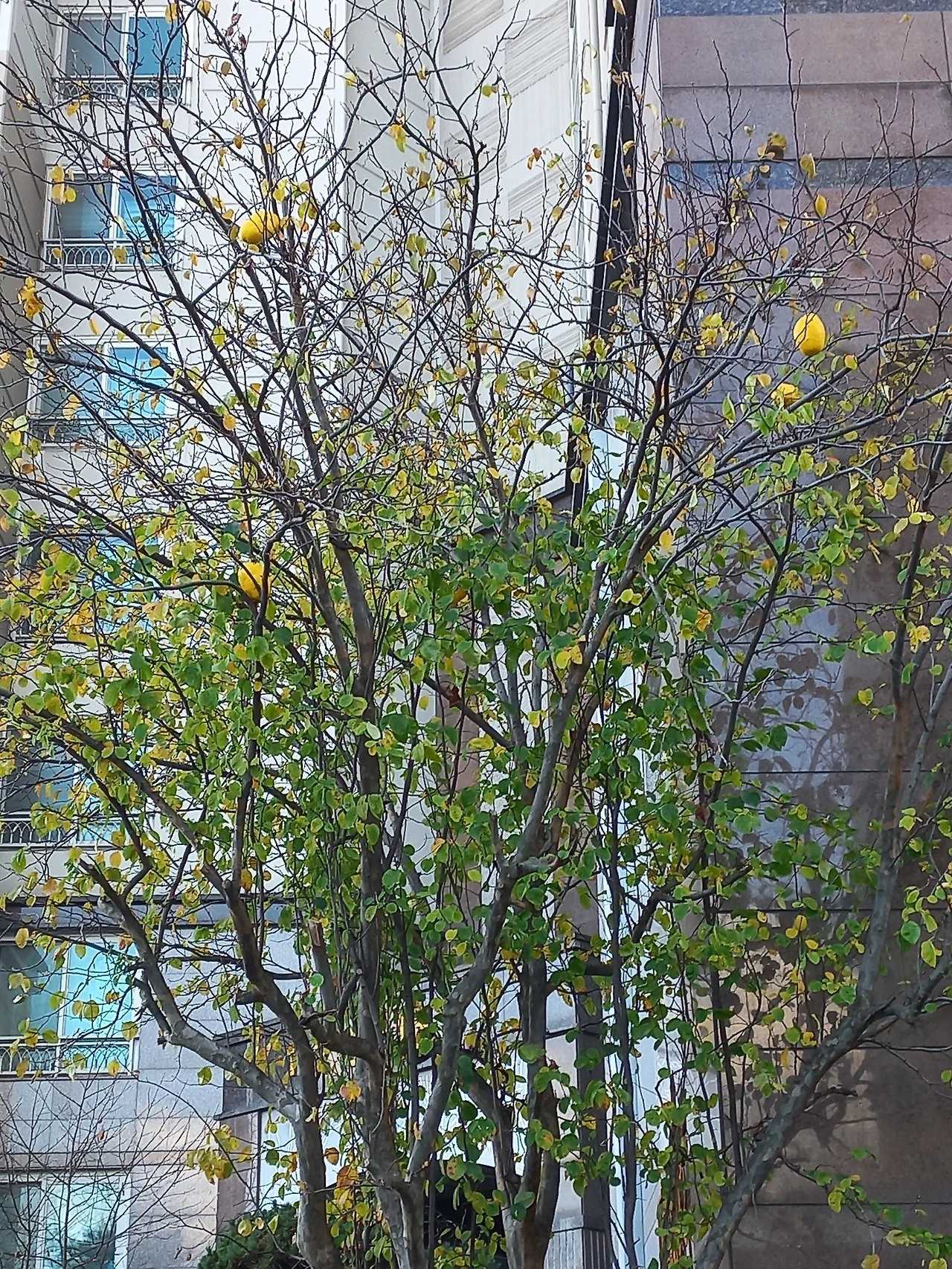 노랗게 잘 익은 모과가 나무에 매달려 있습니다