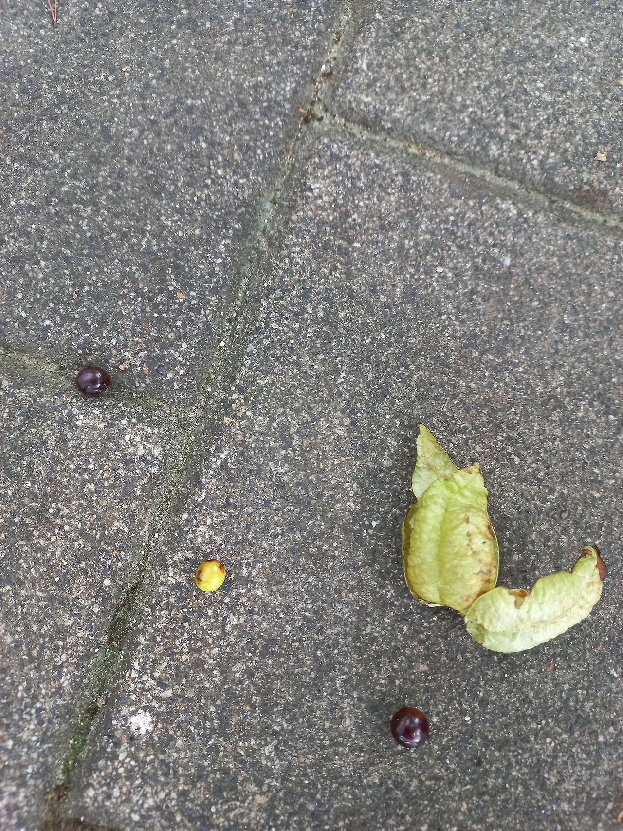 *모감주 열매가 터져 까만 알이 나와 있다