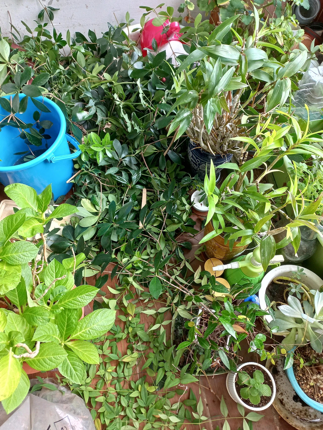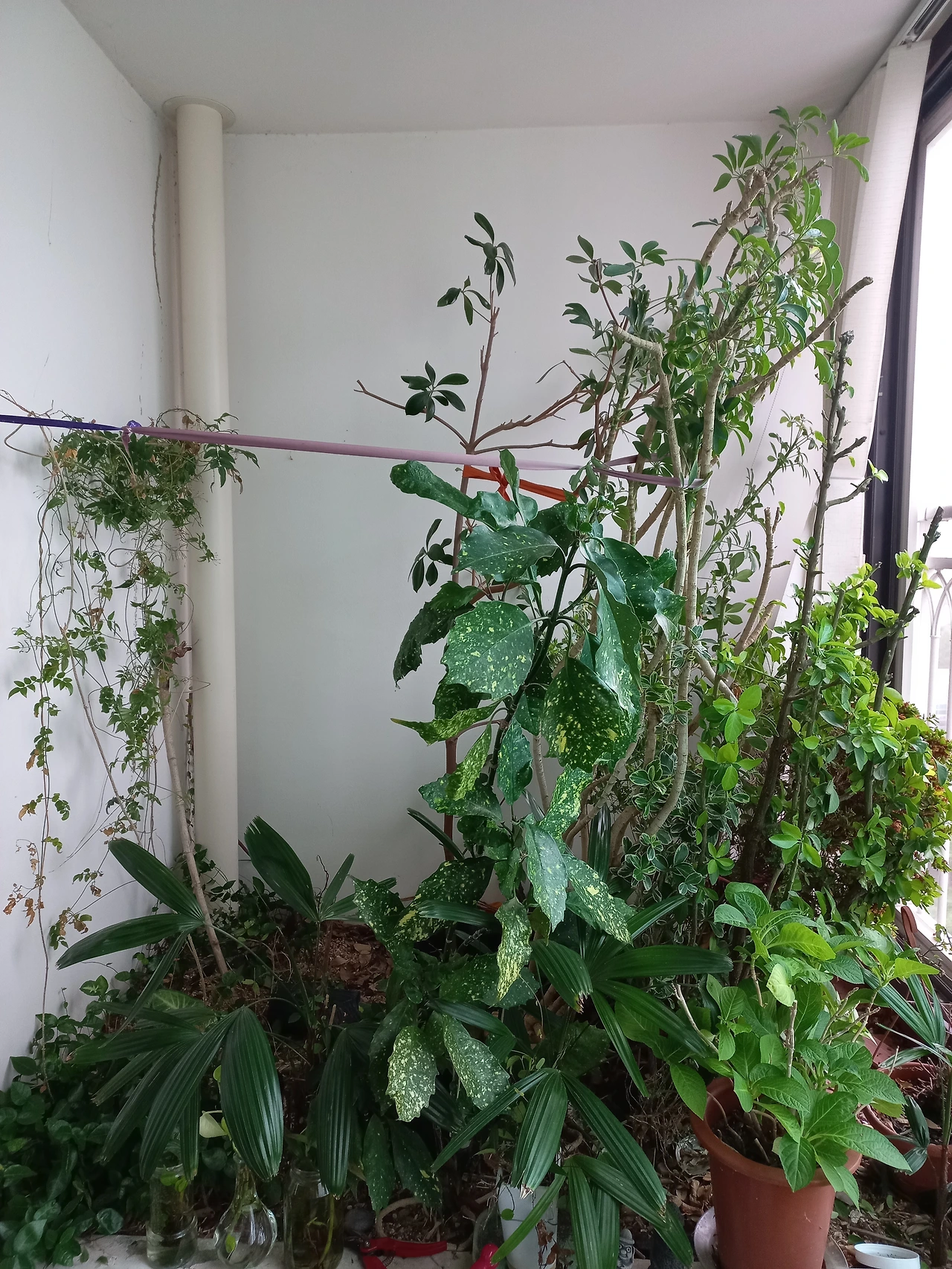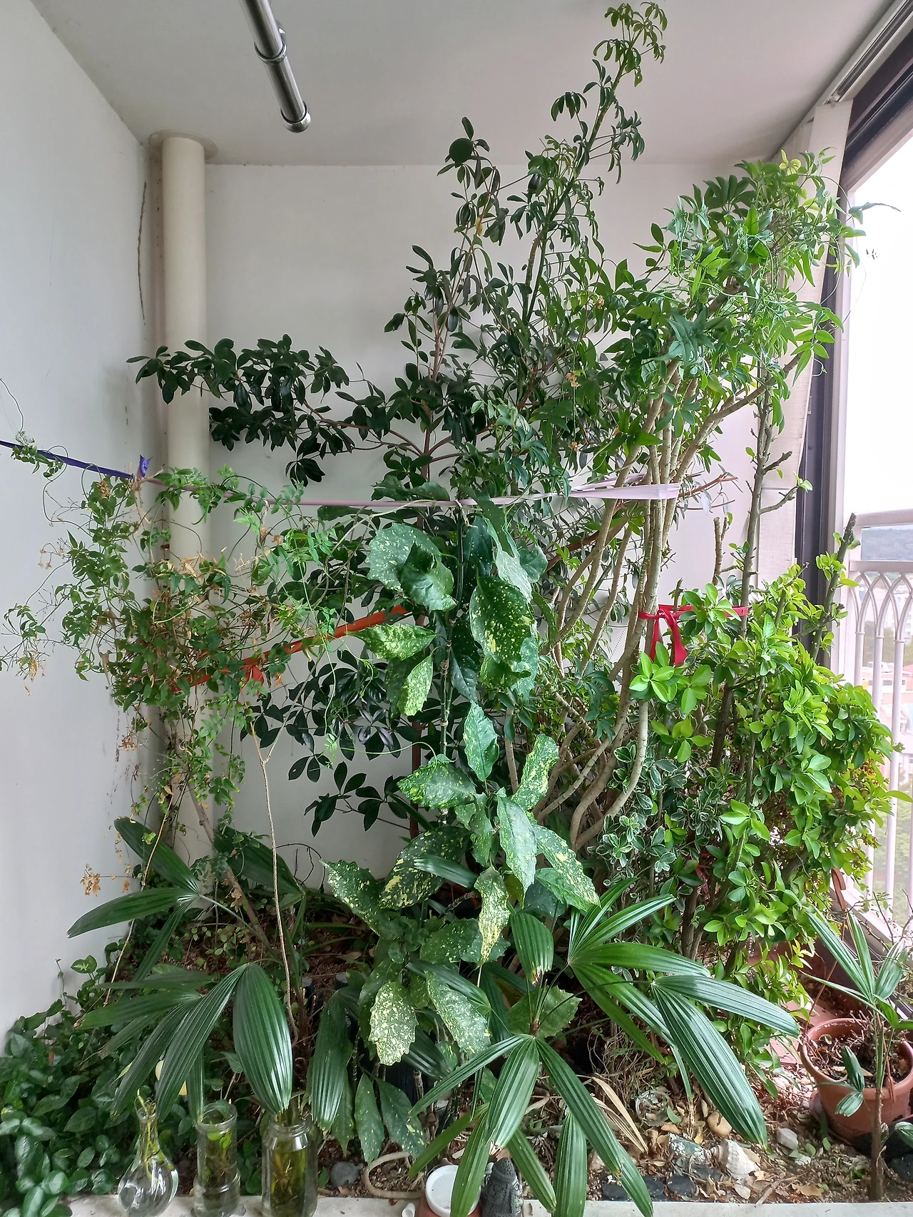 폭염이 계속되니 베란다 화단의 나무들의 우거진(?) 가지와 나뭇잎들이 너무 답답해 보였다. 하나는 홍콩 야자이고 또 다른 하나는 이름이 기억나지 않는다. 십여 년 전에 이사 올 때 인터넷으로 주문한 나무였는데, 이름이 전혀 생각나지 않는다. 그 나무는 무서운 속도로 가지를 뻗고 키를 높이며 자랐다. 홍콩 야자도 성장 속도가 무서울 정도였다. 때때로 가지와 잎들을 잘라주었는데도 몸집을 불려 나가서 따라 잡기가 힘들었다.