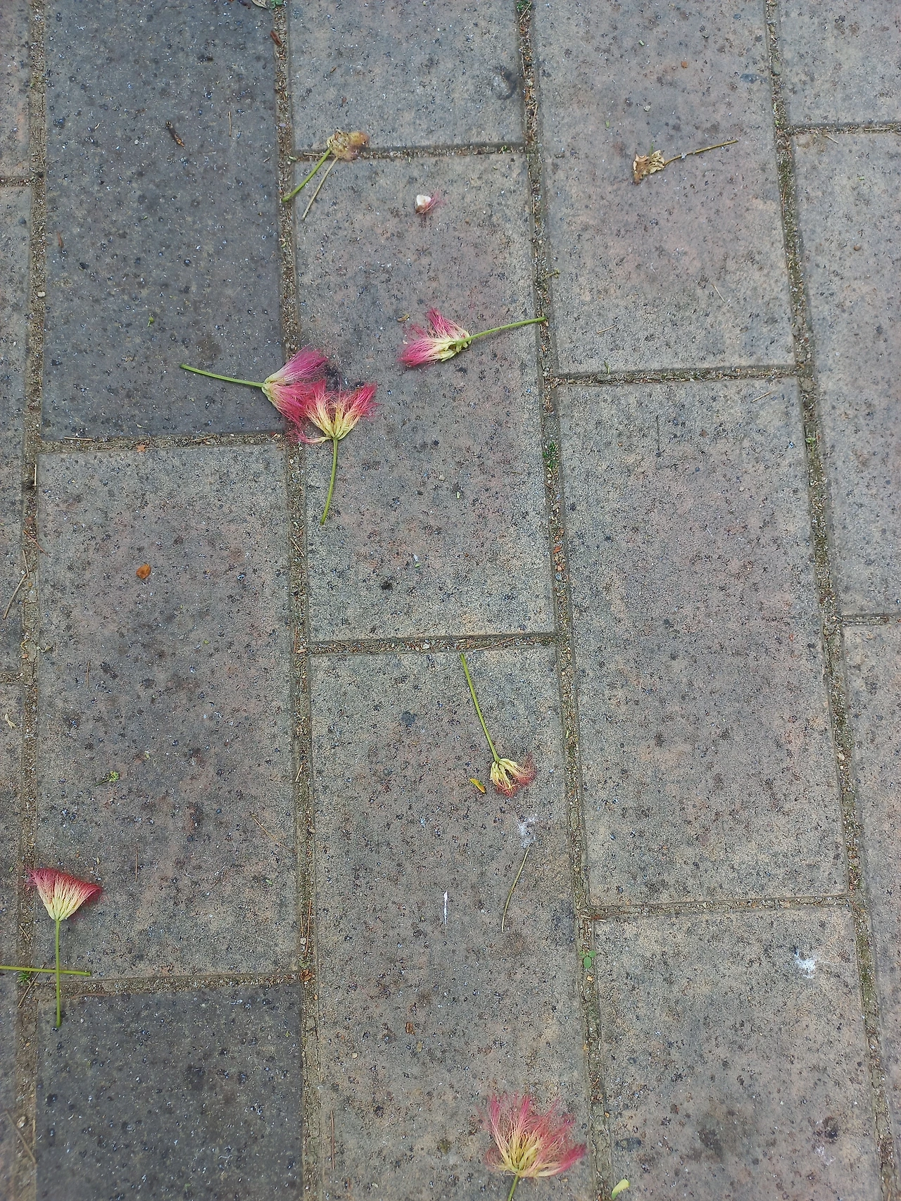 바닥에 자귀나무 꽃들이 떨어져 있었다