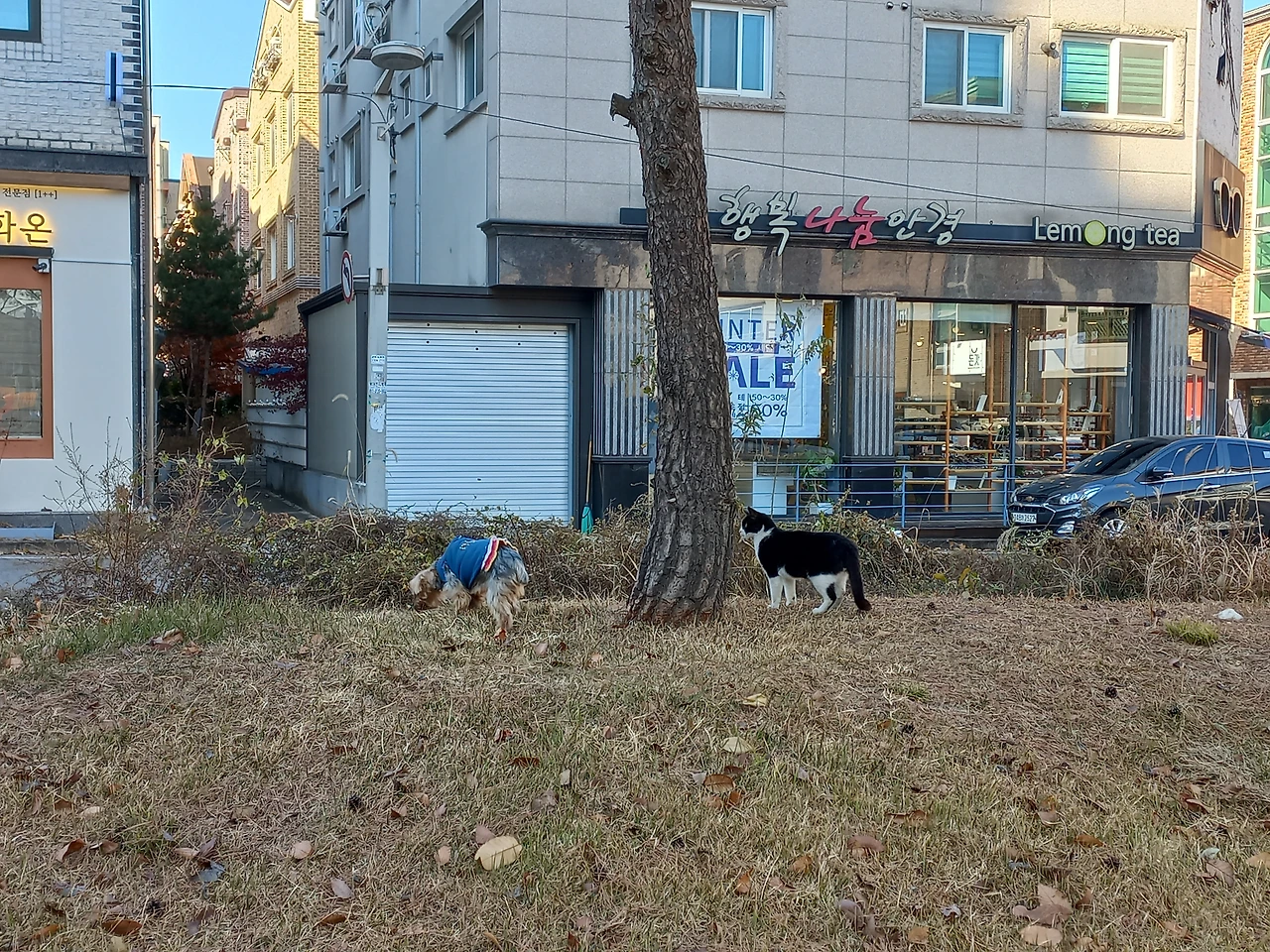 고양이는 날렵하게 강아지를 좇아간다