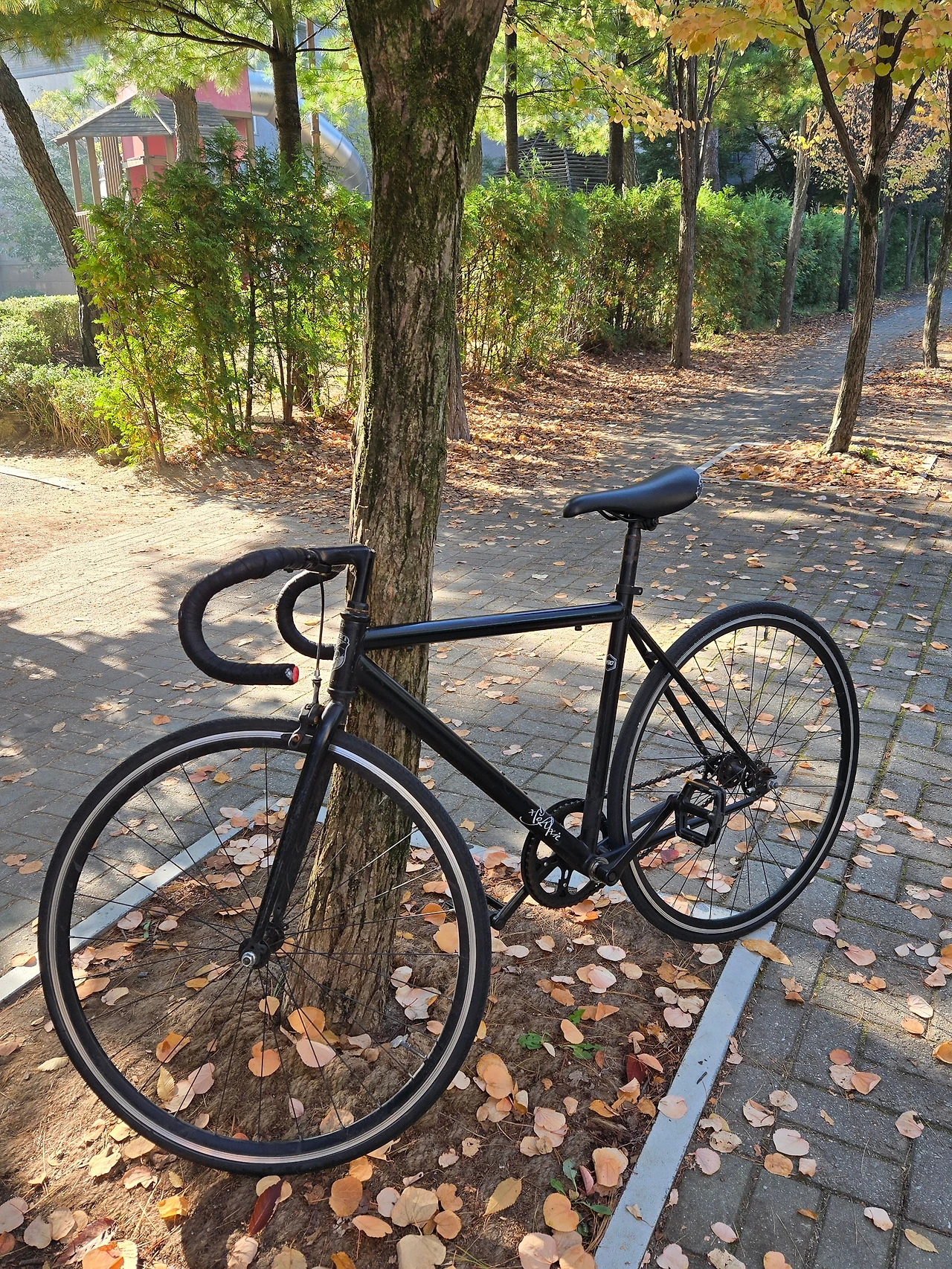자전거가 나무에 밀착되어 있다