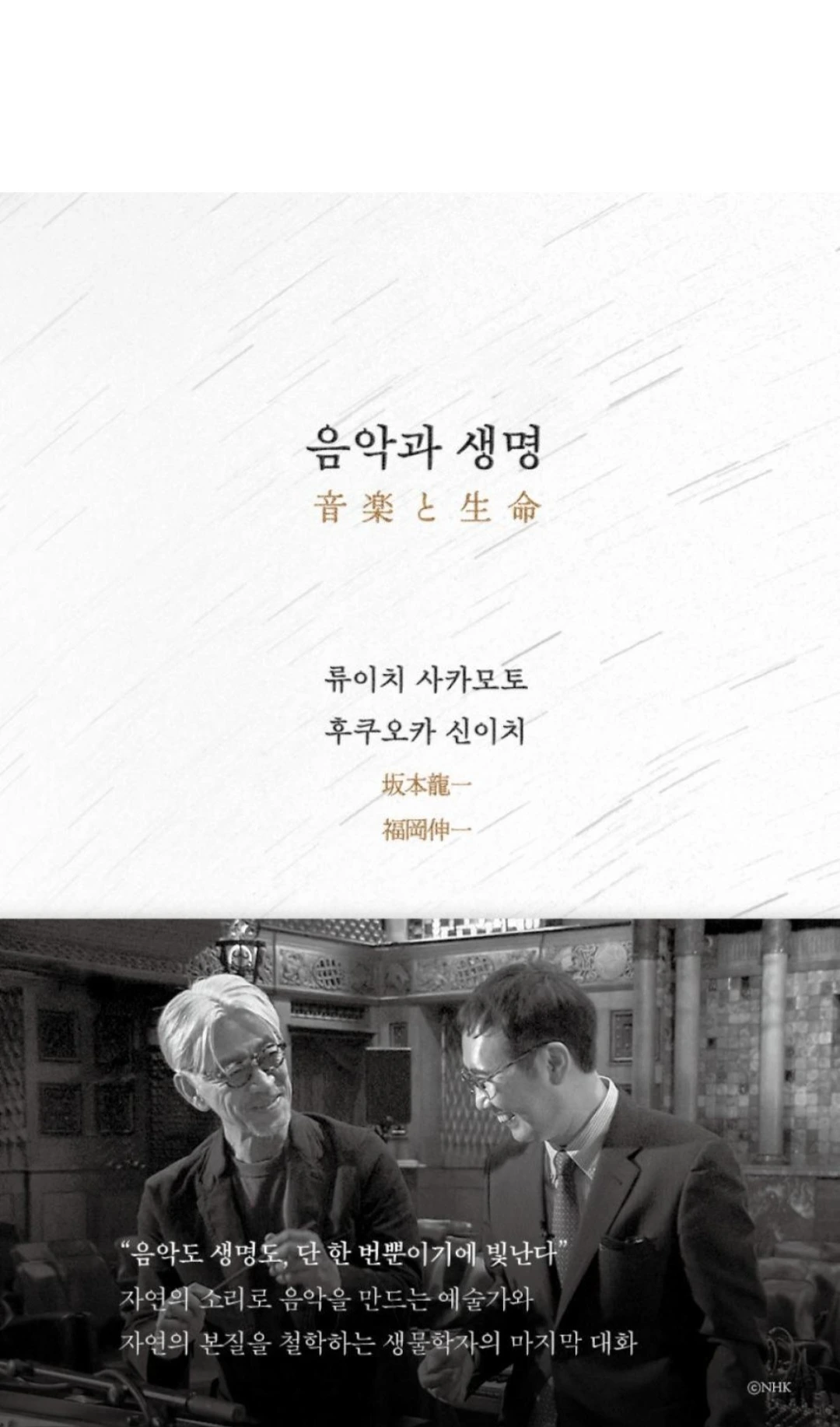 류이치 사카모토와 후쿠오카 신치치의 음악과 생명에 관한 대담. 음악가와 과학자의 각각 다른 분야의 대가들의 대담이었지만, 생각보다 그들의 공감대가 넓어서 무척 흥미로웠다.