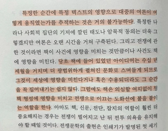 요즘 남북전쟁부터 냉전의 종식에 이르기까지 책이 전쟁에서 수행한 역할을 추적한 『전쟁과 책』(아르테, 2025)이라는 저작을 읽고 있다. 『전쟁과 책』에서 저자는 책이 전쟁 발발에 지대한 영향을 미친다는 점을 인정하면서도, “특정한 순간에 특정 텍스트의 영향으로 대중의 여론이 어떻게 움직였는가를 추적하는 것은 거의 불가능”(p.90)하다는 신중한 태도를 보인다.